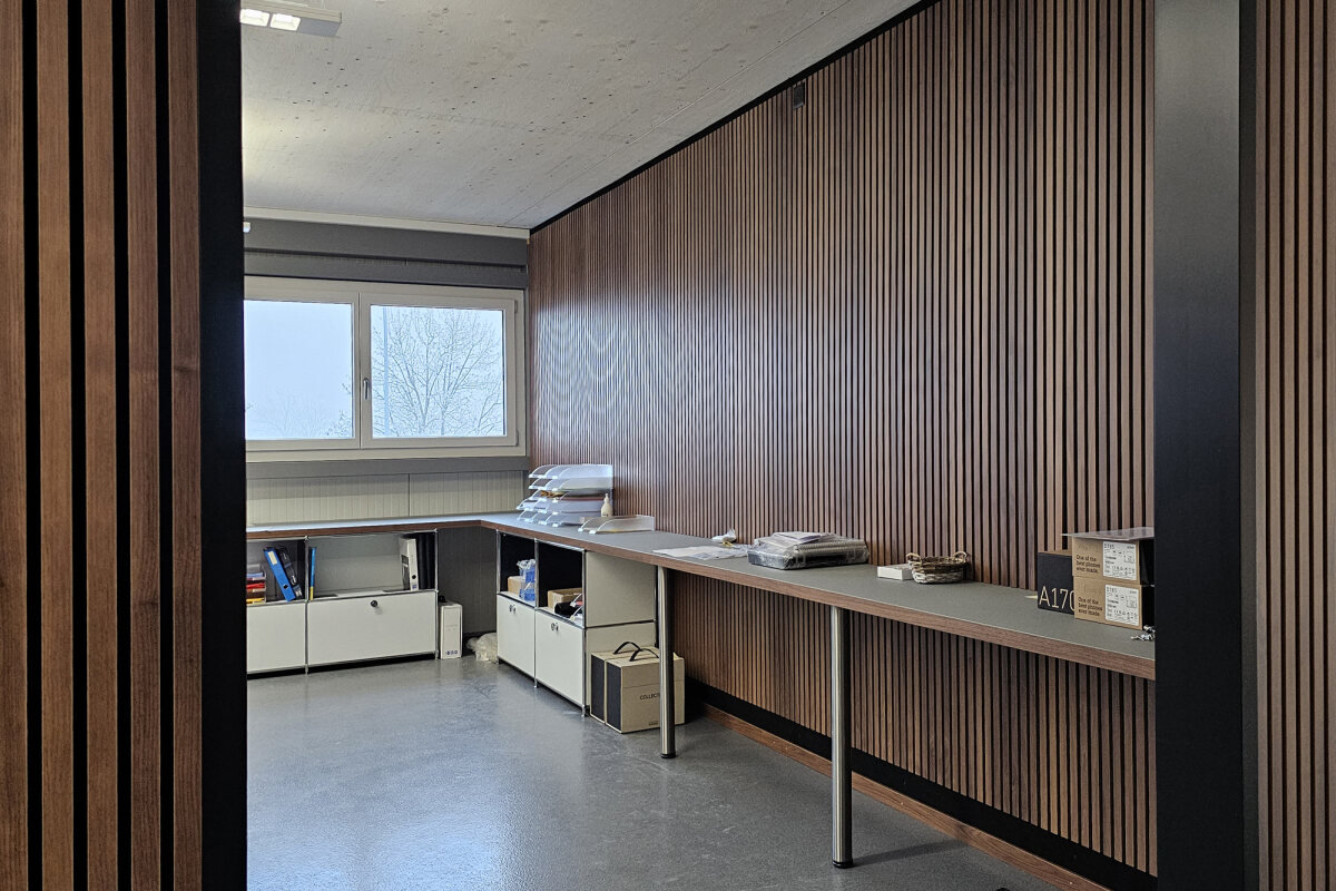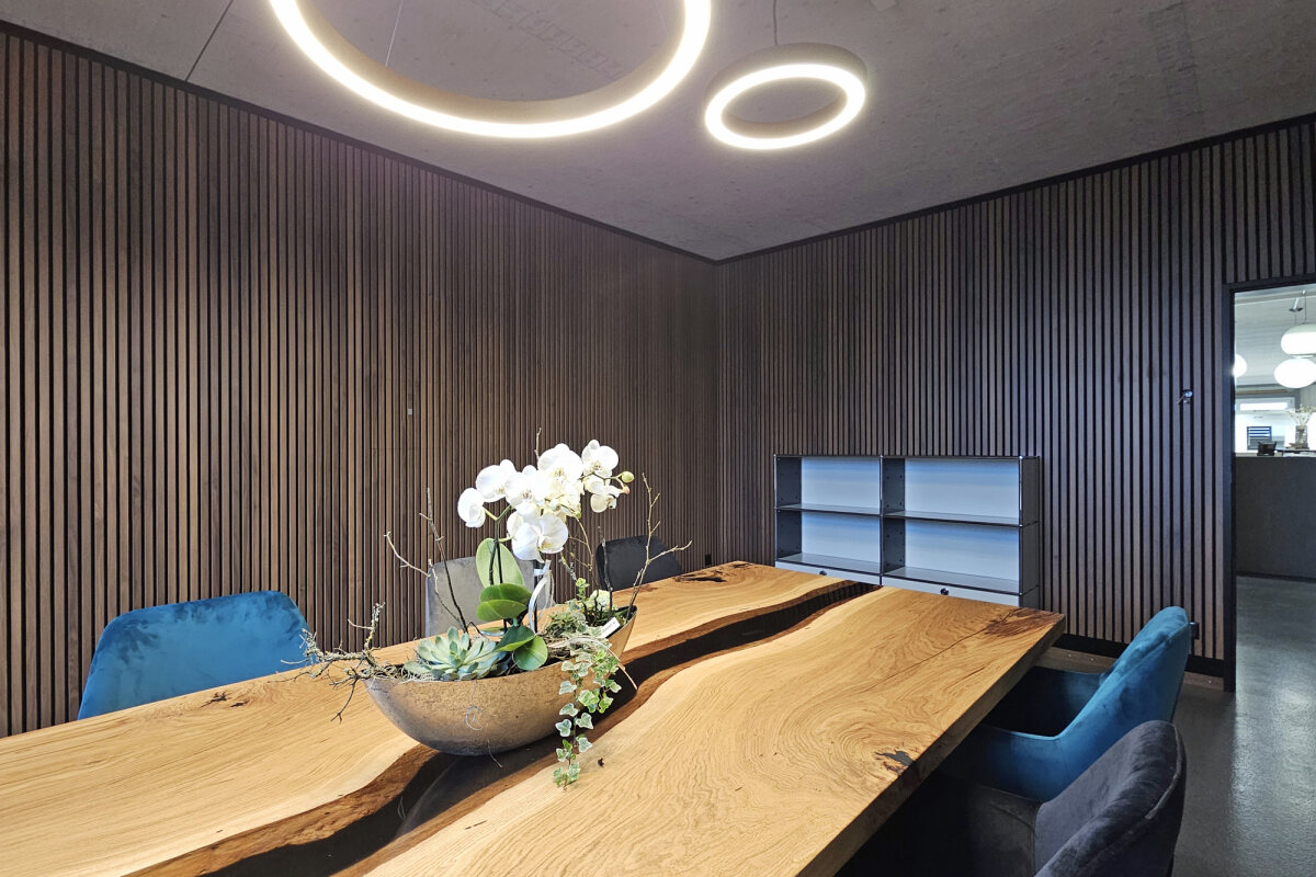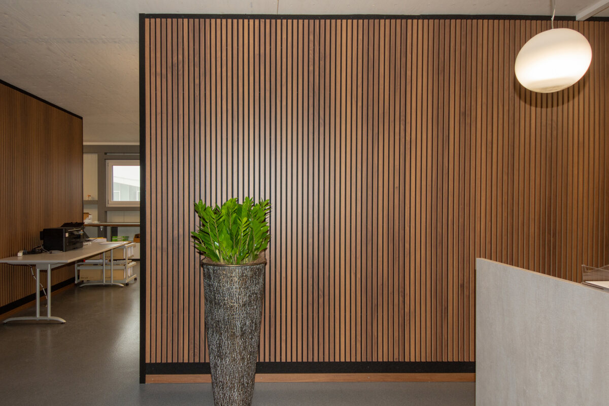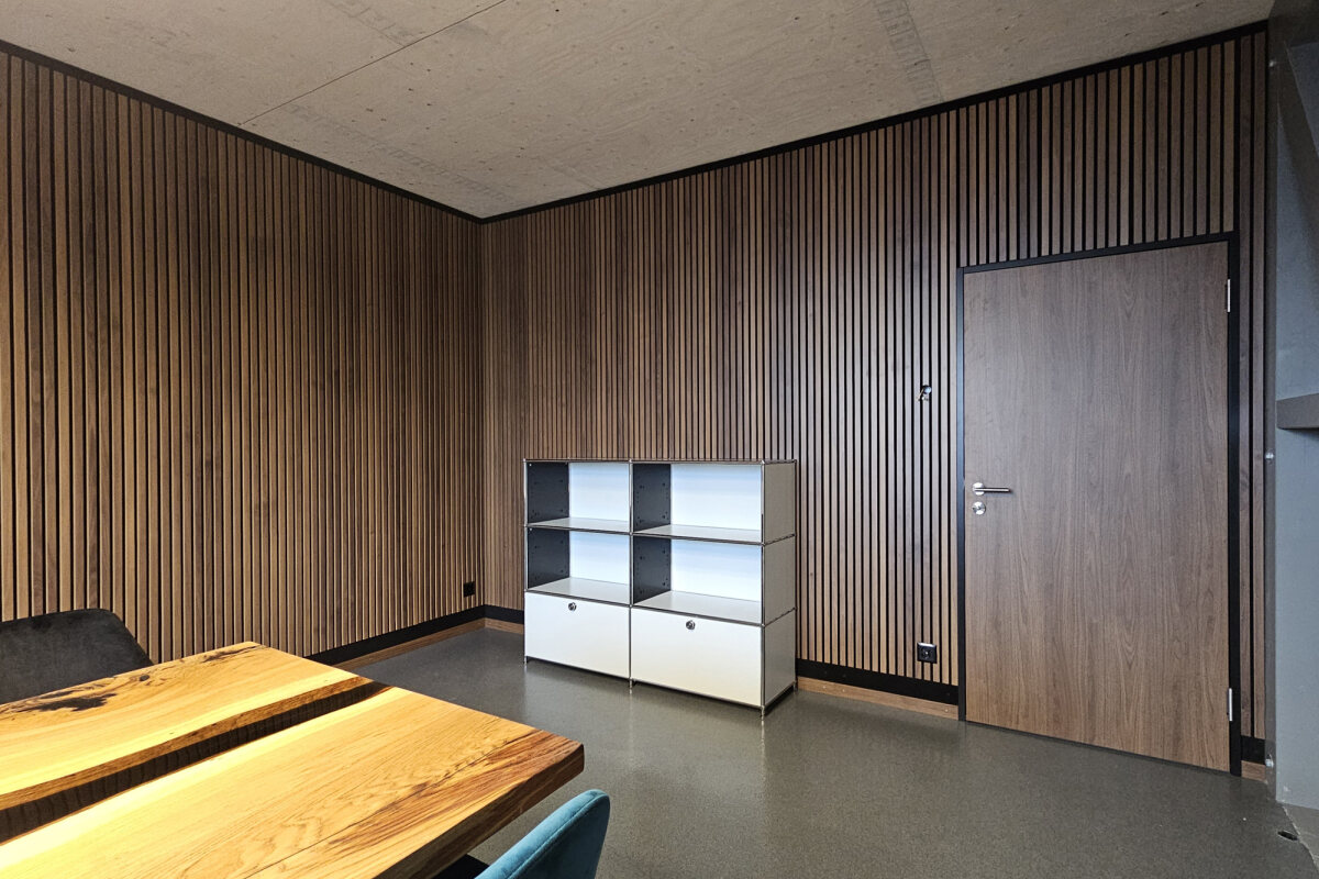 - Akustikwände mit hoch absorbierenden Akustikelementen, Deckleisten in Holzoptik, eingefasst mit schwarzen Abschlüssen
