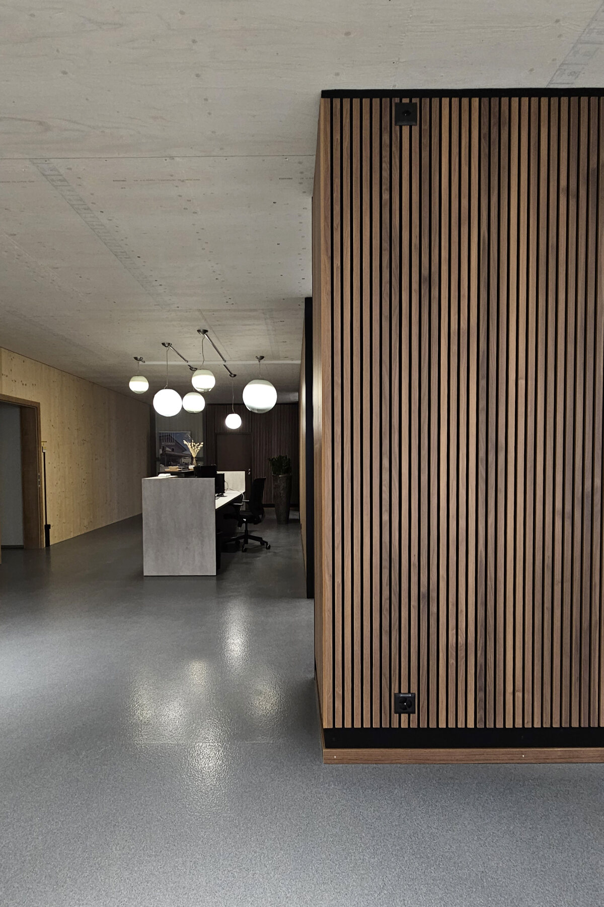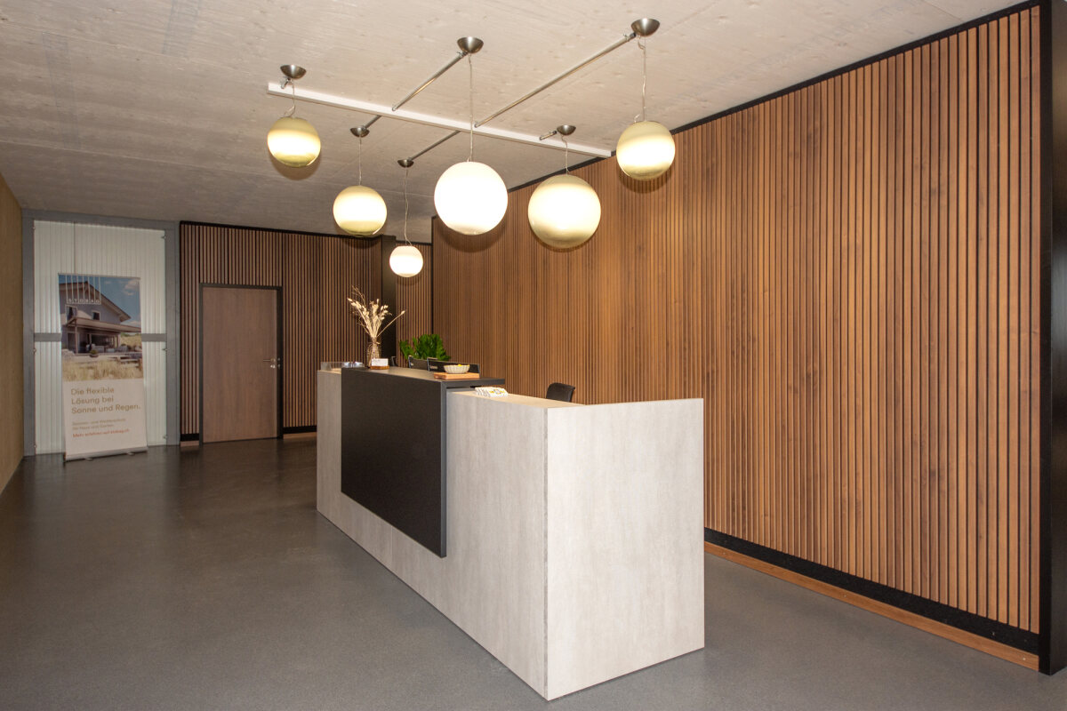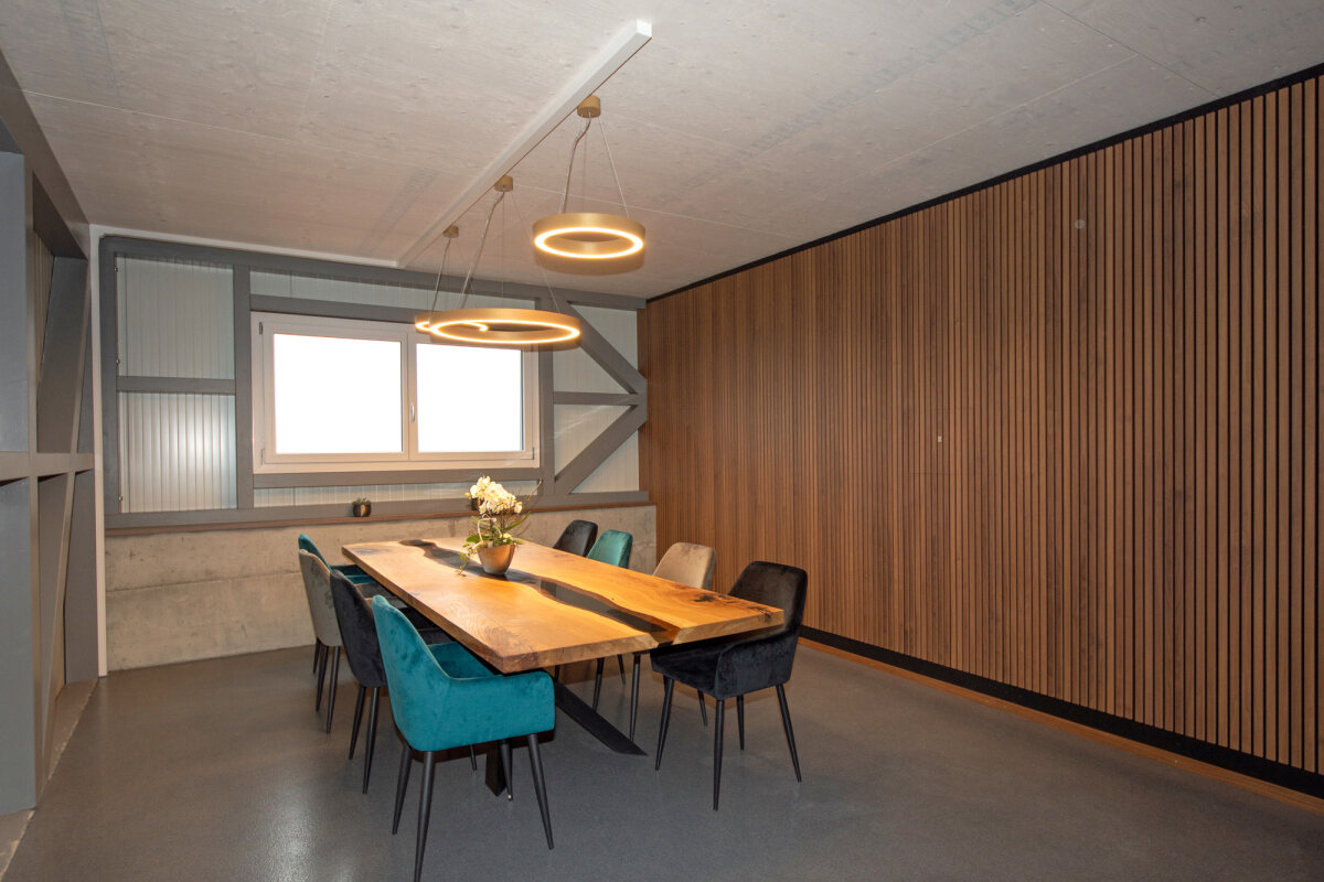 - Akustikwände mit hoch absorbierenden Akustikelementen, Deckleisten in Holzoptik, eingefasst mit schwarzen Abschlüssen