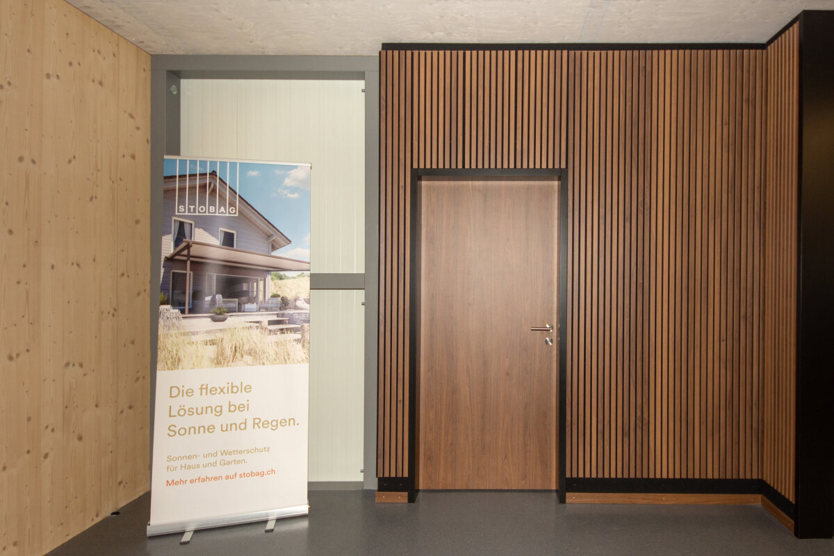 - Schallschutz-Bürotüre in der gleichen Holzoptik und schwarzem Blockfutter
