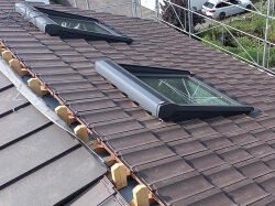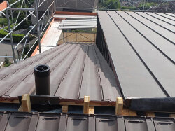 Unsere Spengler haben die PRFA-Falzbahnen fachgerecht auf der Lukarne installiert. Die Dachrinne ist angebracht und sorgt für eine effiziente Entwässerung. Das Flachdach des Balkons wurde erfolgreich abgedichtet und geschweisst.