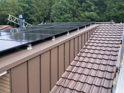 Das Dach ist zwischenzeitlich mit Ziegel eingedeckt und die Dachfenster-Storen sind ebenfalls montiert.