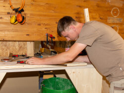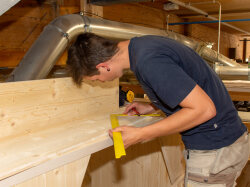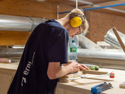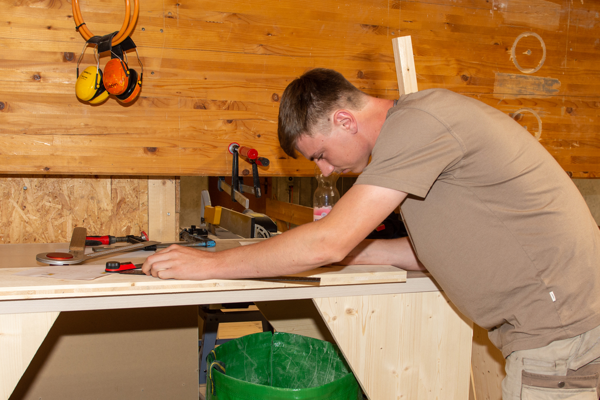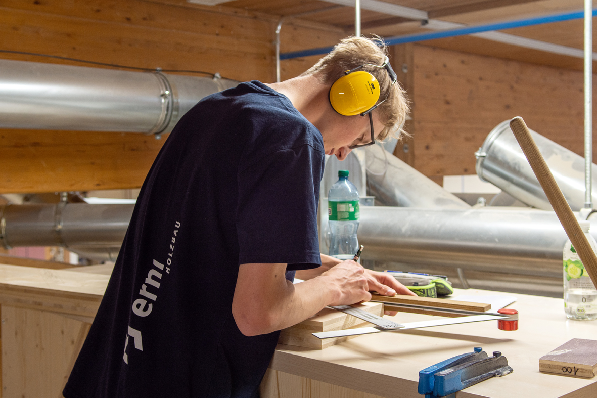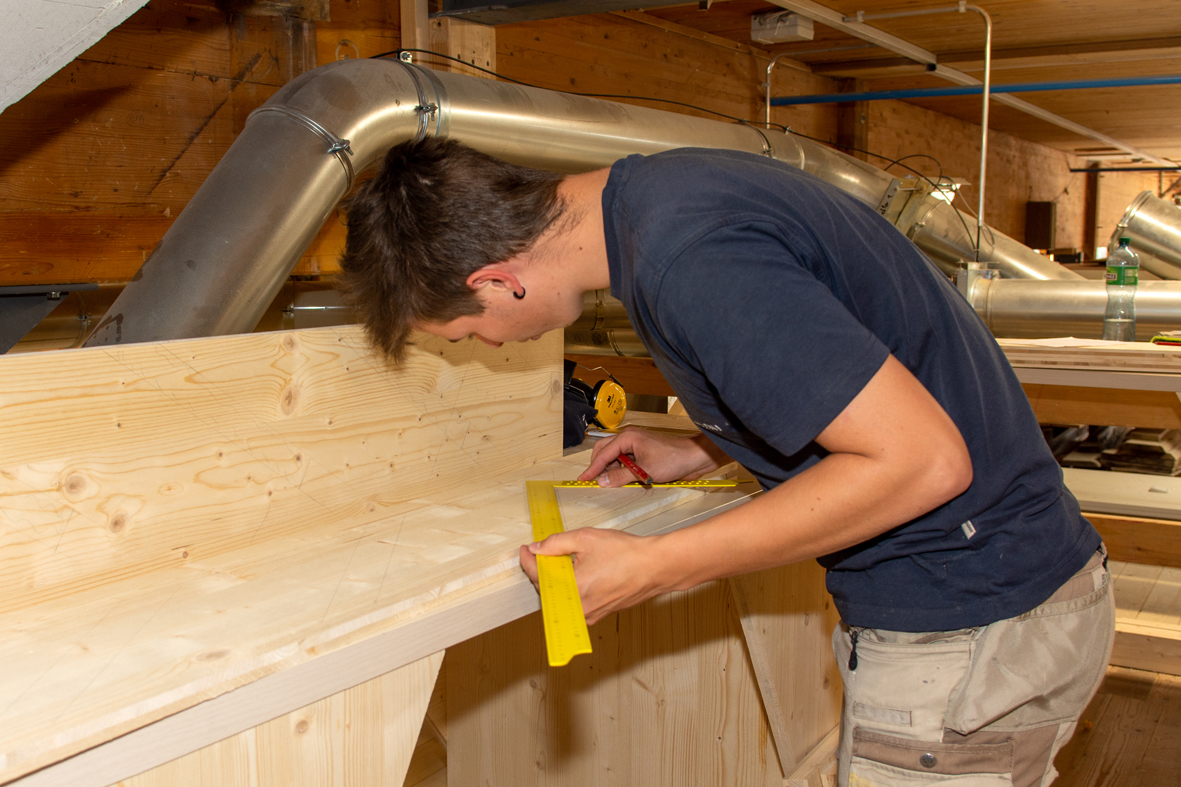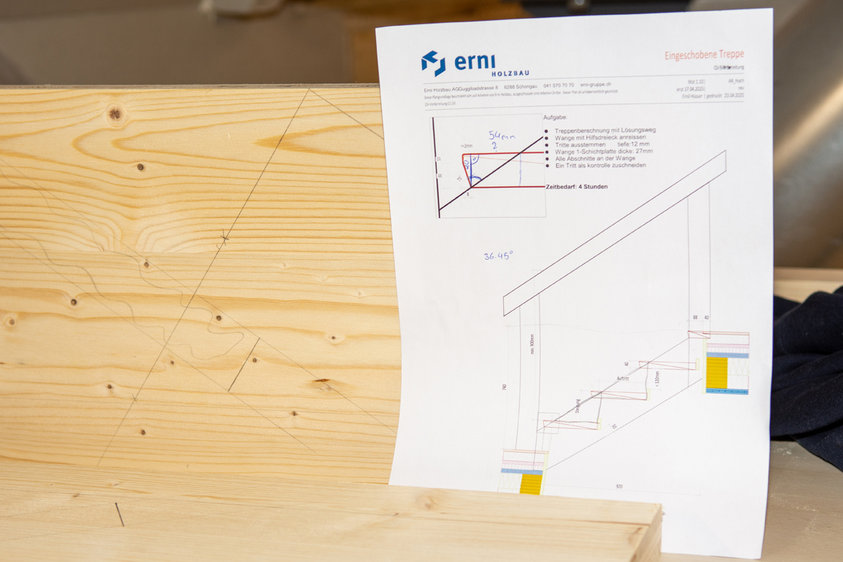 Heute stand eine besondere Herausforderung an: das Zimmern einer eingeschobenen Treppe. Volle Konzentration, präzises Arbeiten – genau wie an der Prüfung!