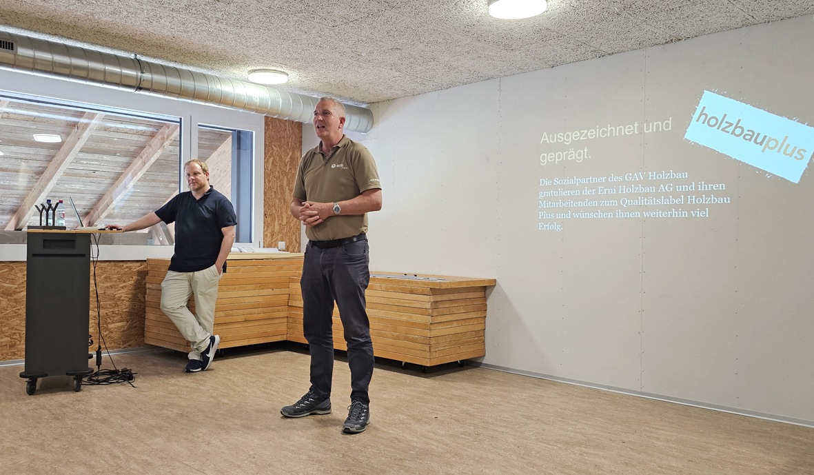 Peter Henggeler durfte offiziell das Label „Holzbau Plus“ entgegennehmen – bereits zum vierten Mal in Folge. Dies ist gültig bis Ende 2028. Das Label würdigt unser Engagement für faire Bedingungen, Mitarbeitendenförderung und moderne Unternehmenskultur.
