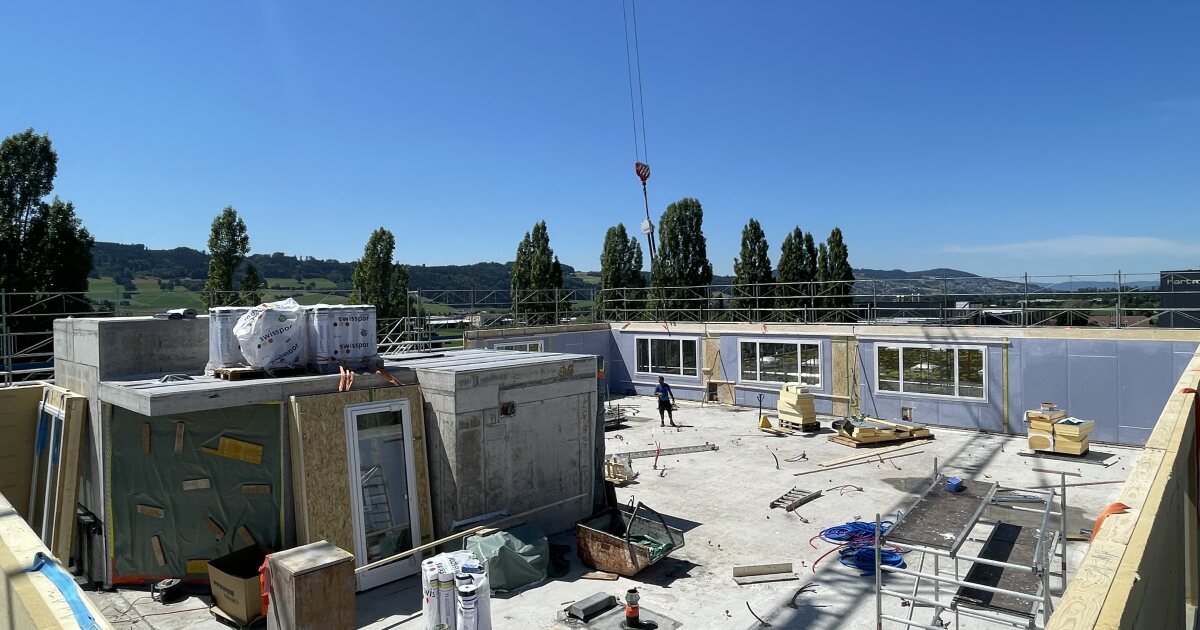 In einem Unternehmen in Hitzkirch wird ein zusätzliches Stockwerk in Elementbauweise errichtet. Die Produktionsfläche wird um eine Etage erweitert, und daher wird das neue Bürogebäude um eine Etage nach oben in den Neubau verlegt.