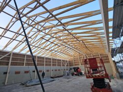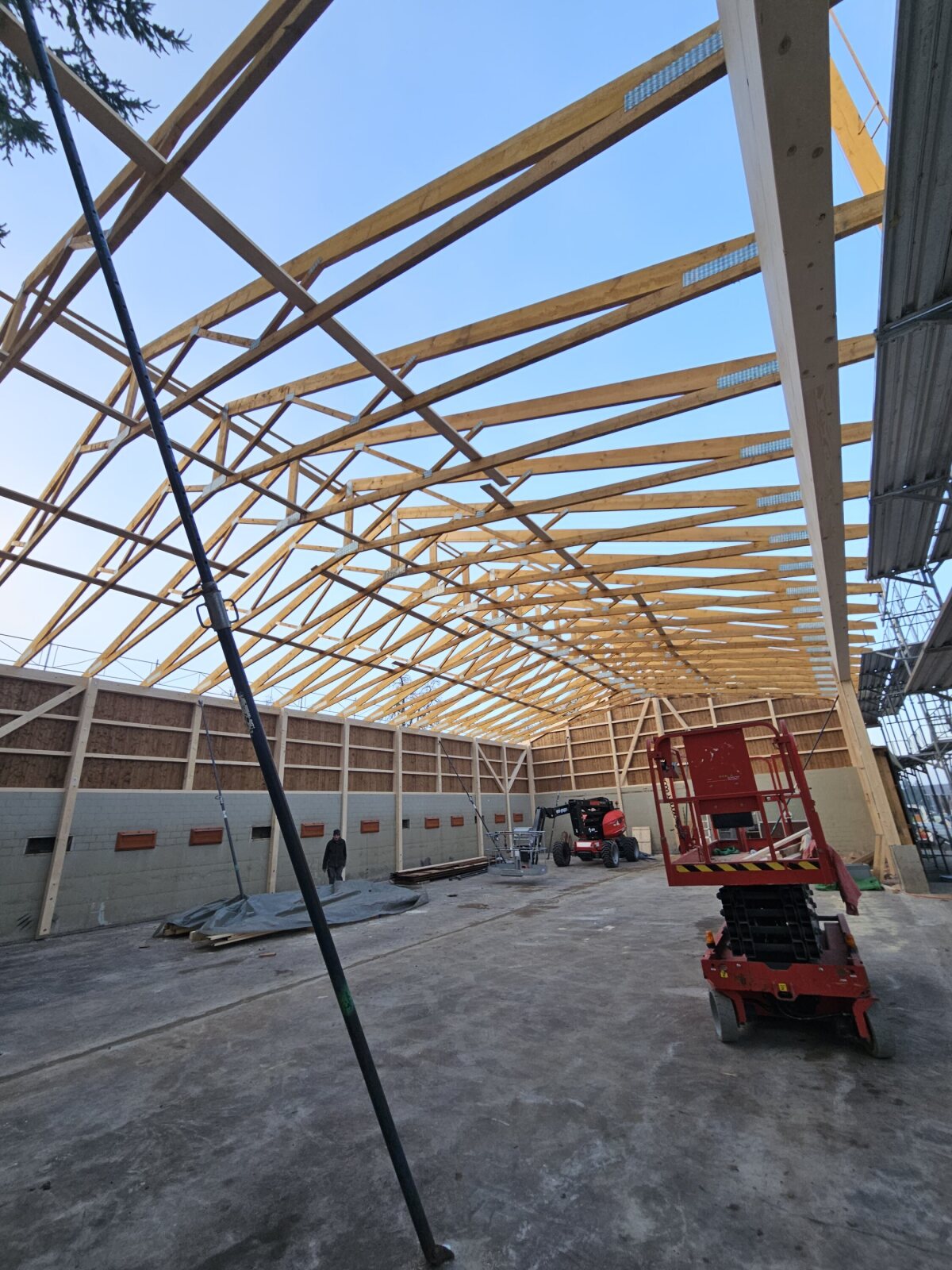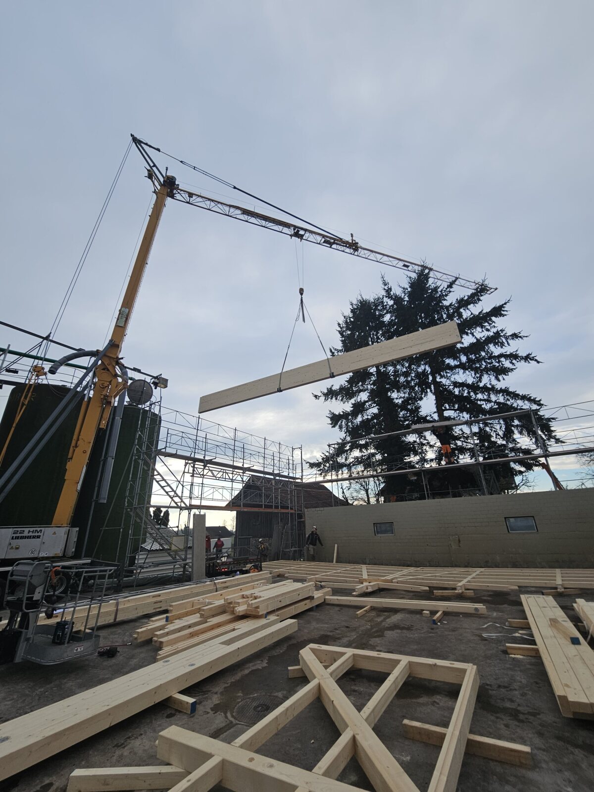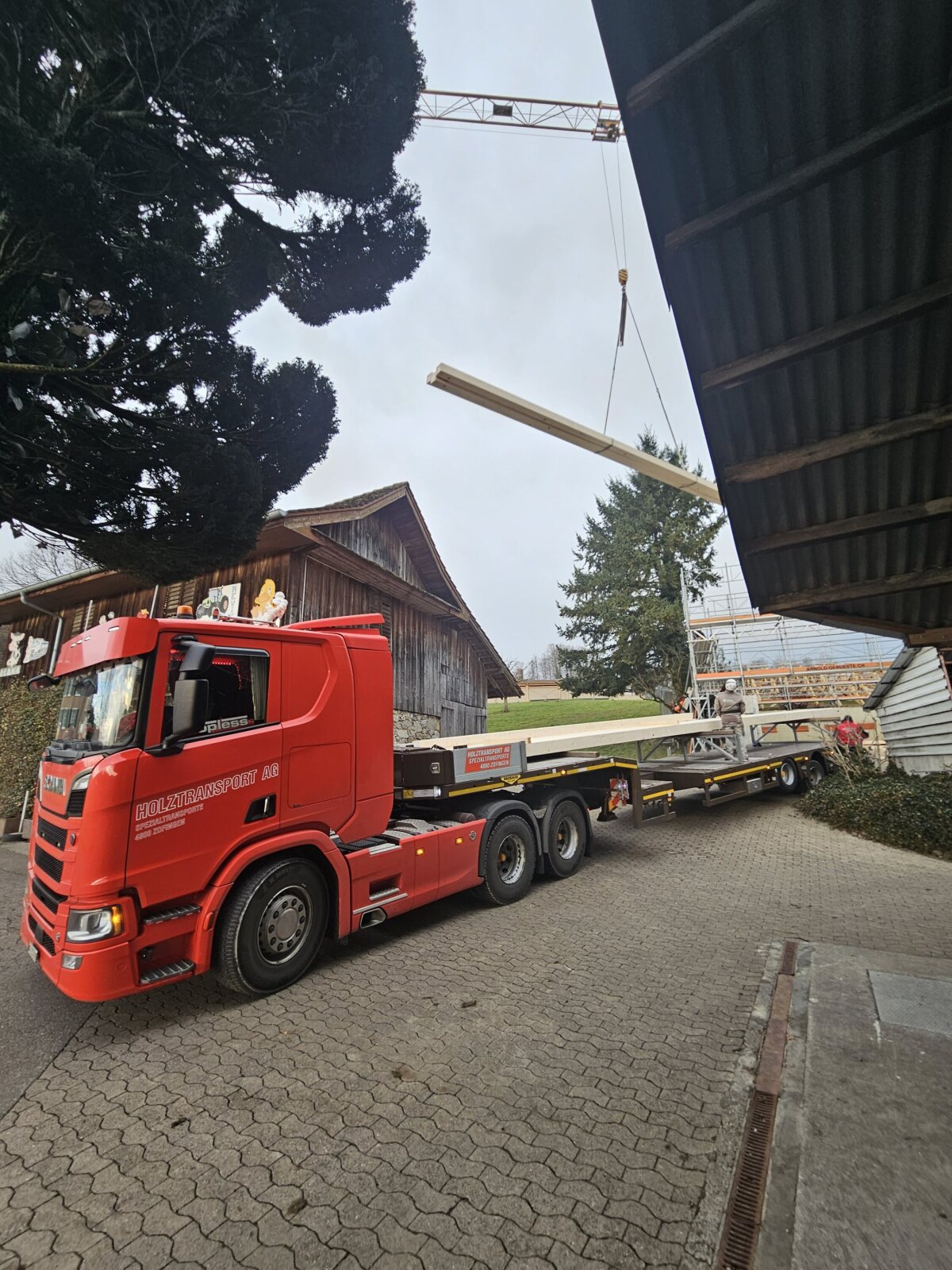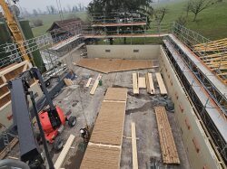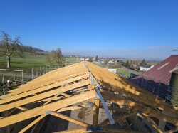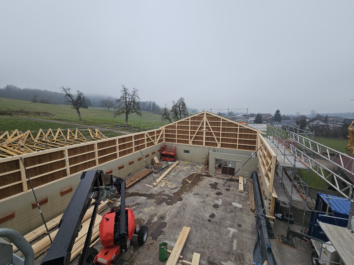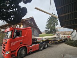 Ein ehemaliger Hühnerstall wird zu einer Remise umgenutzt. Die neuen Riegelwände wurden auf der Baustelle zusammengesetzt und anschliessend auf die bestehenden Mauern aufgerichtet. Die bestehende Dachkonstruktion (Nagelbinder) wurde wieder aufgerichtet, neu mit einer Durchfahrtshöhe von 4 m.
