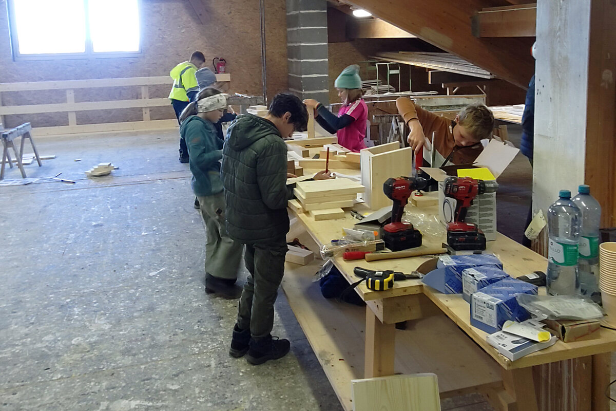 Der Morgen startete mit einer Betriebsführung, bei der viele neugierige Fragen gestellt wurden. Danach legten die Kinder aus dem Holzbereich los: Es entstanden individuelle Vogelhäuser, und sie frästen, bohrten, schraubten und schliffen hoch motiviert an ihren eigenen Werken.