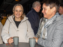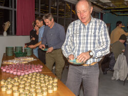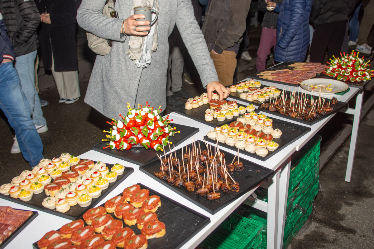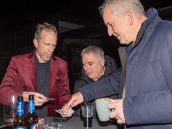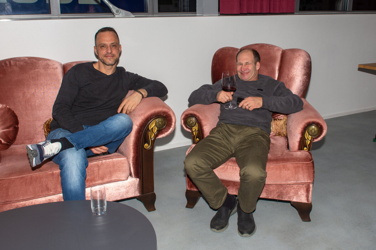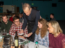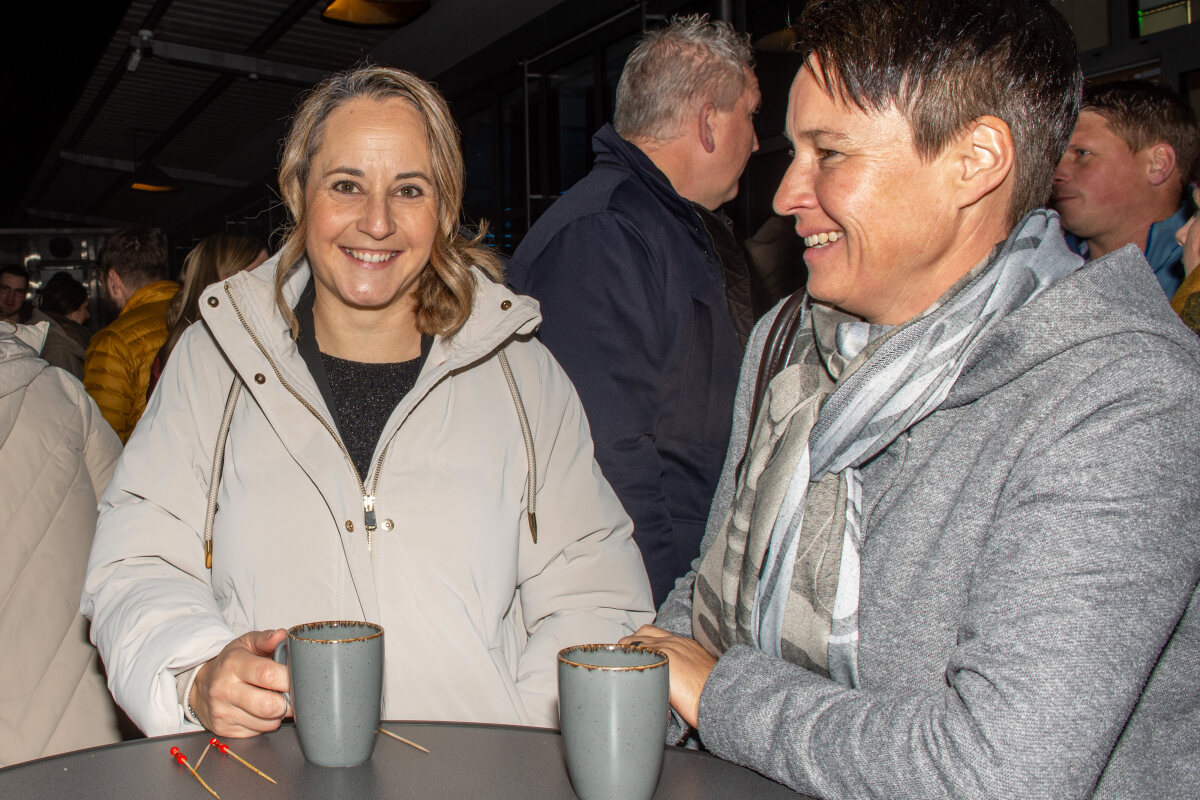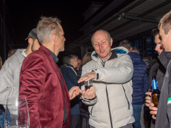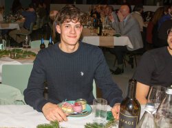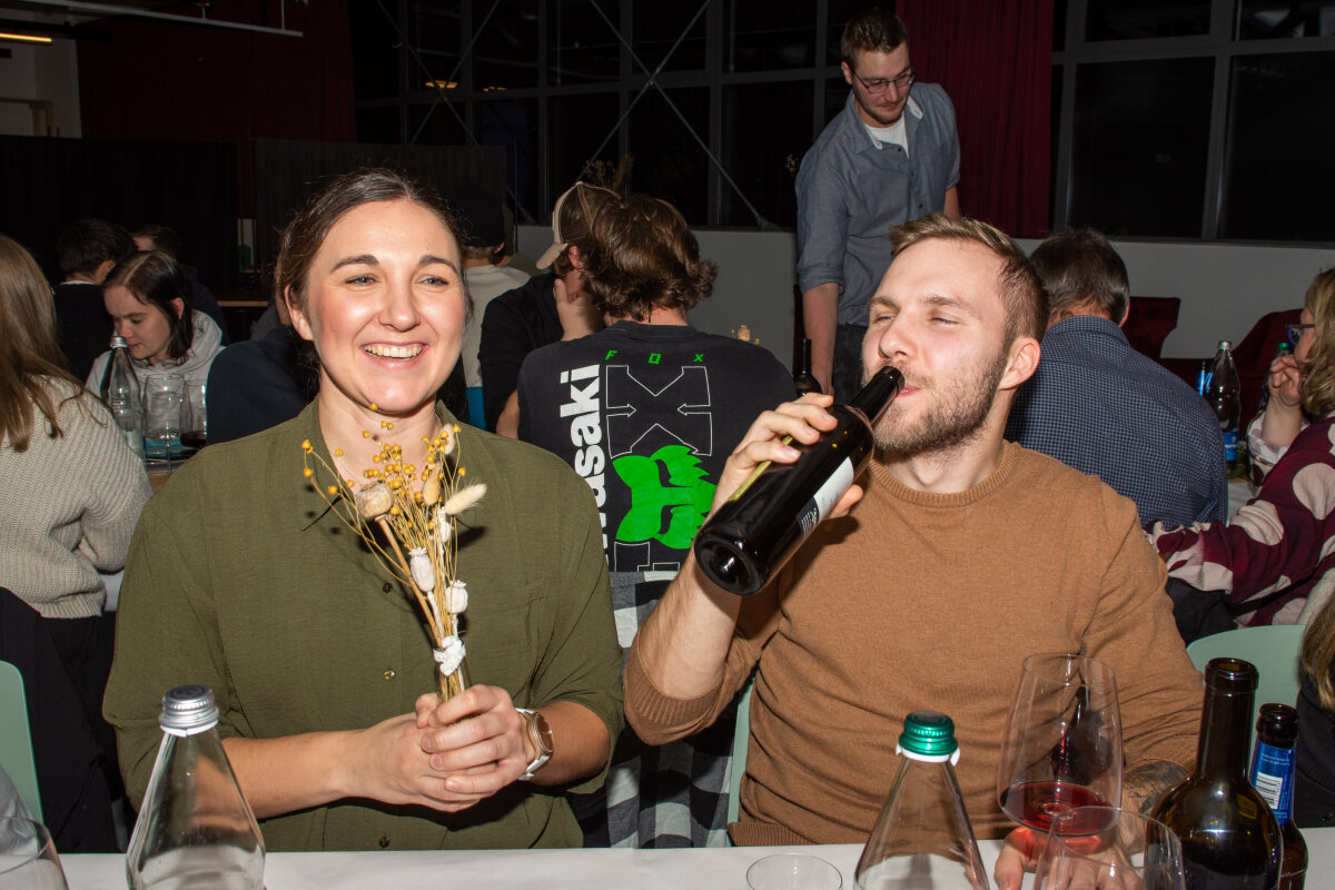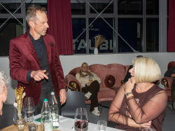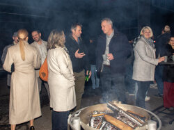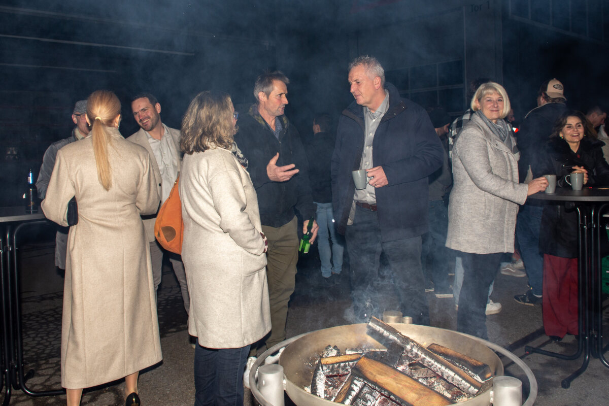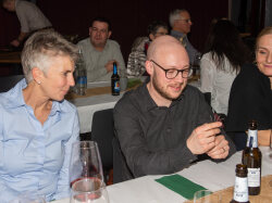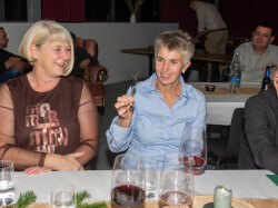 Der Abend begann mit einem grosszügigen Apéro im Freien, bei dem unter anderem Glühwein serviert wurde. Peter begrüsste die Anwesenden und stimmte sie auf den gemeinsamen Abend ein. Um 19.00 Uhr begab sich die Gesellschaft in den festlich dekorierten Saal.