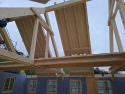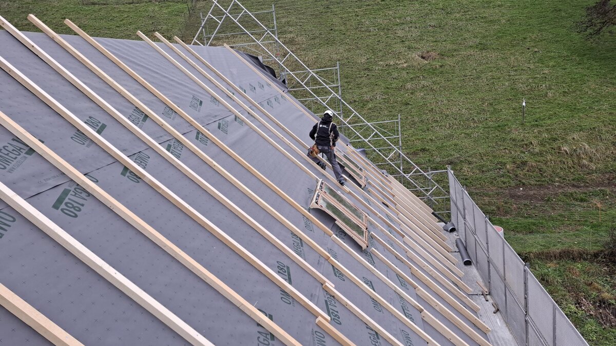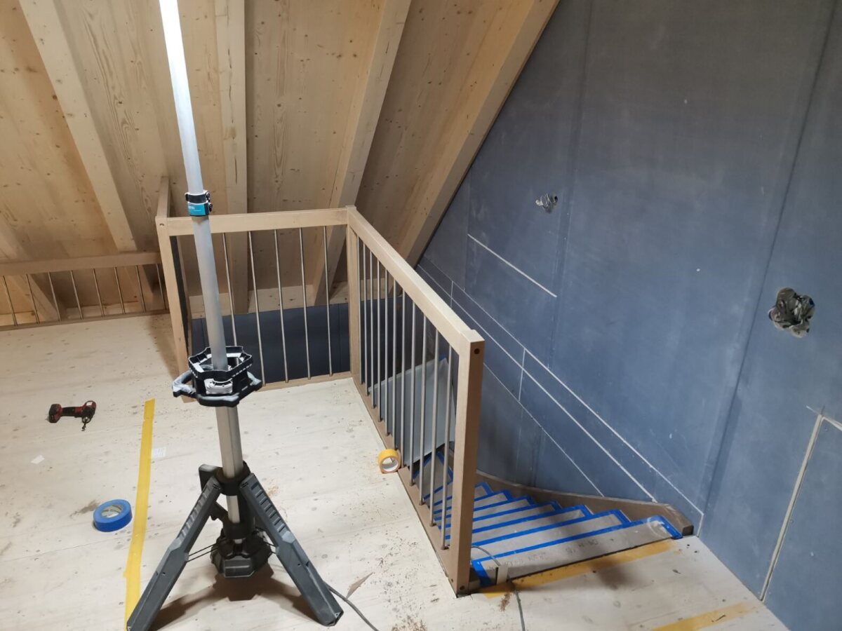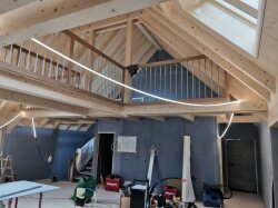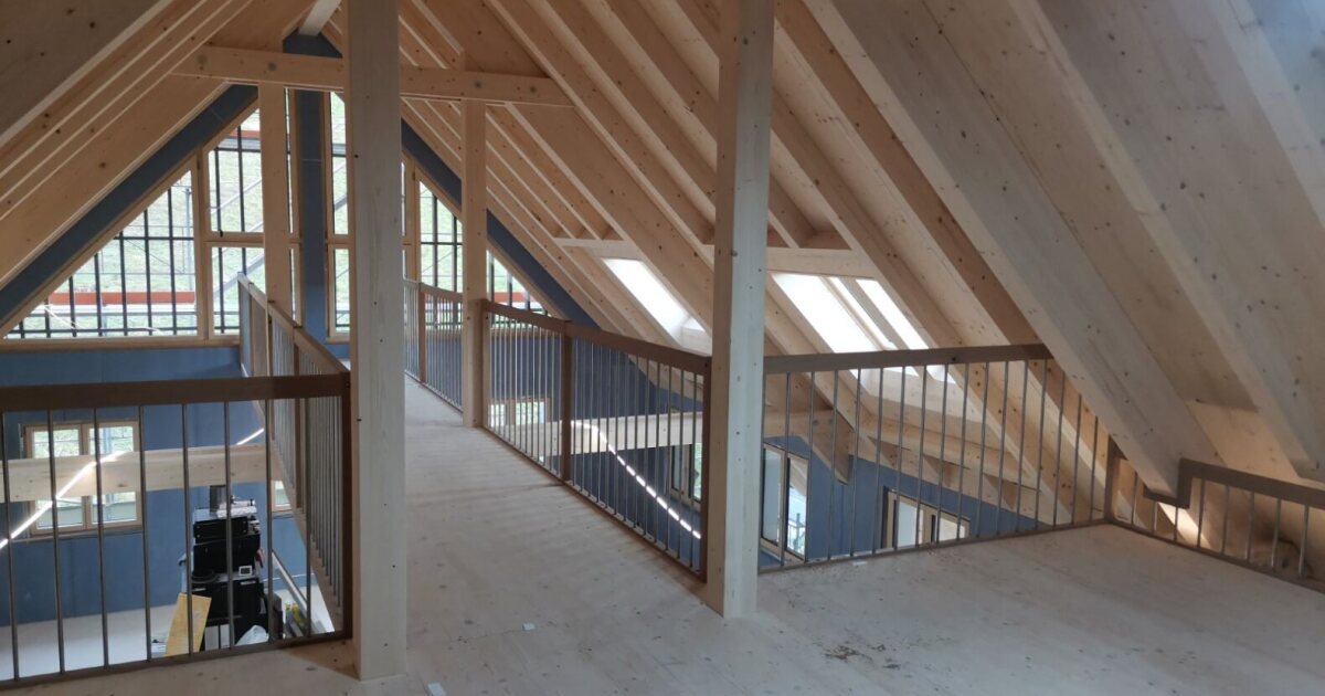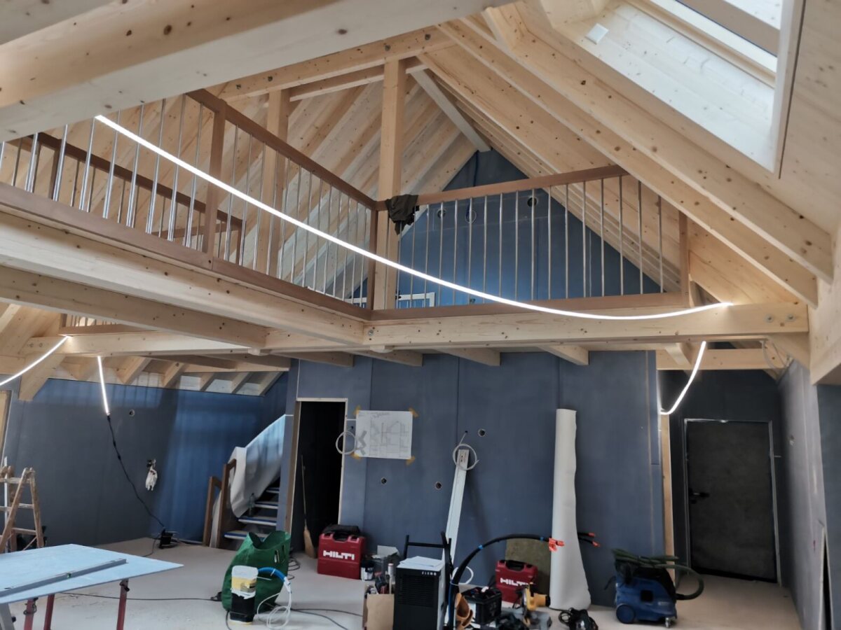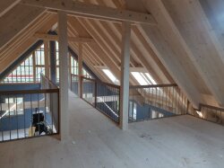 Wir kommen mit dem Innenausbau beim Bauernhaus gut voran – auch die Galerie nimmt immer mehr Form an. Die sichtbare Holzkonstruktion, die montierten Geländer und die Grosszügigkeit der Galerie kommen dabei besonders schön zur Geltung.
