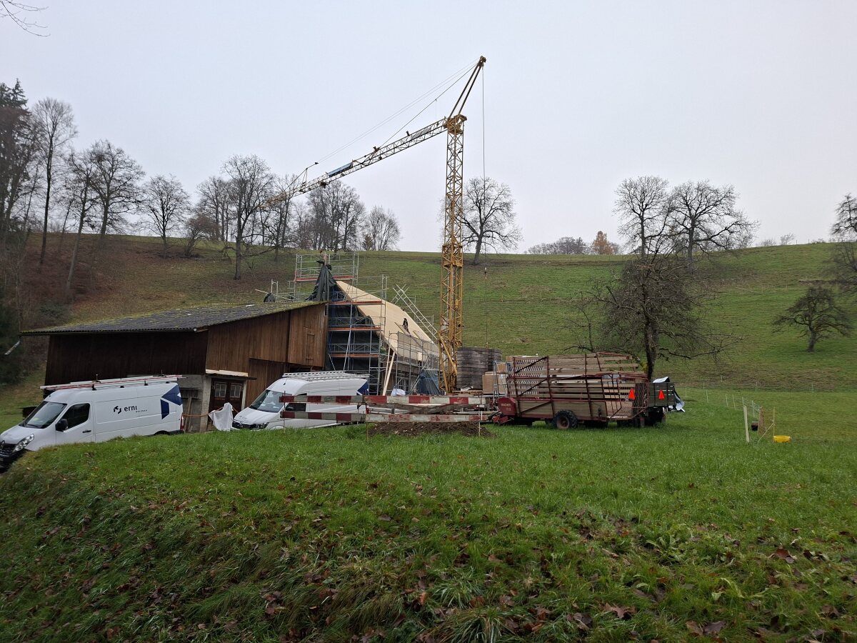 In Egliswil realisieren wir einen Ersatzbau für ein bestehendes Bauernhaus. Die Bauarbeiten haben bereits begonnen, der Rohbau ist im Aufrichten.