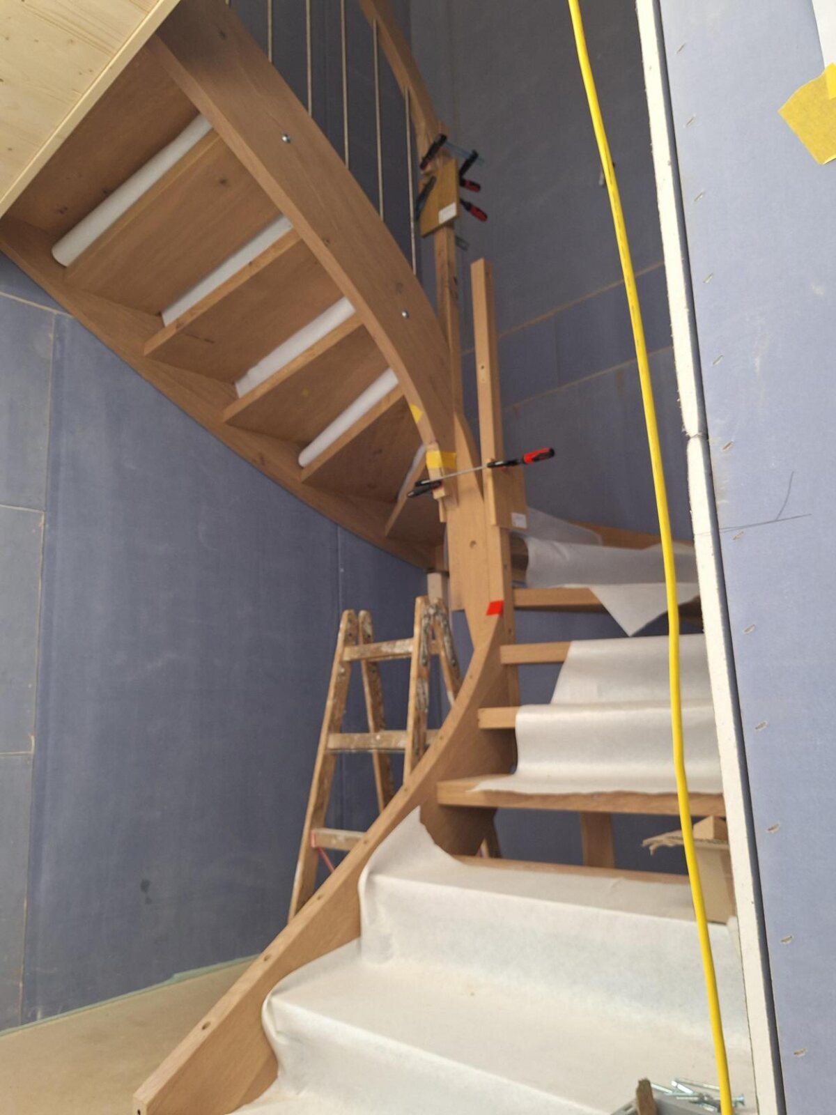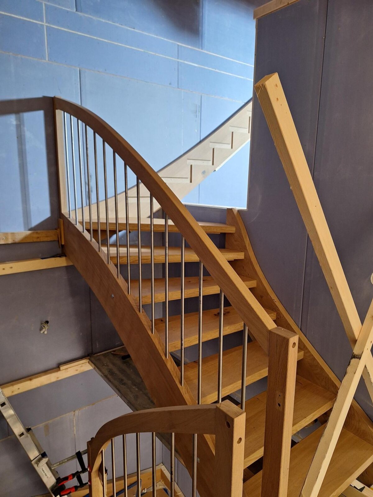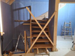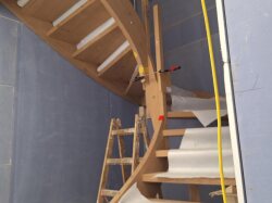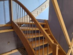 Auf der Baustelle in Egliswil führt zurzeit unsere Sparte Ausbau die Montage der Holztreppe aus. Dazu gehören das exakte Ausrichten der Konstruktion, das Fixieren der Tragteile sowie der Schutz der Stufen während der Bauphase.
