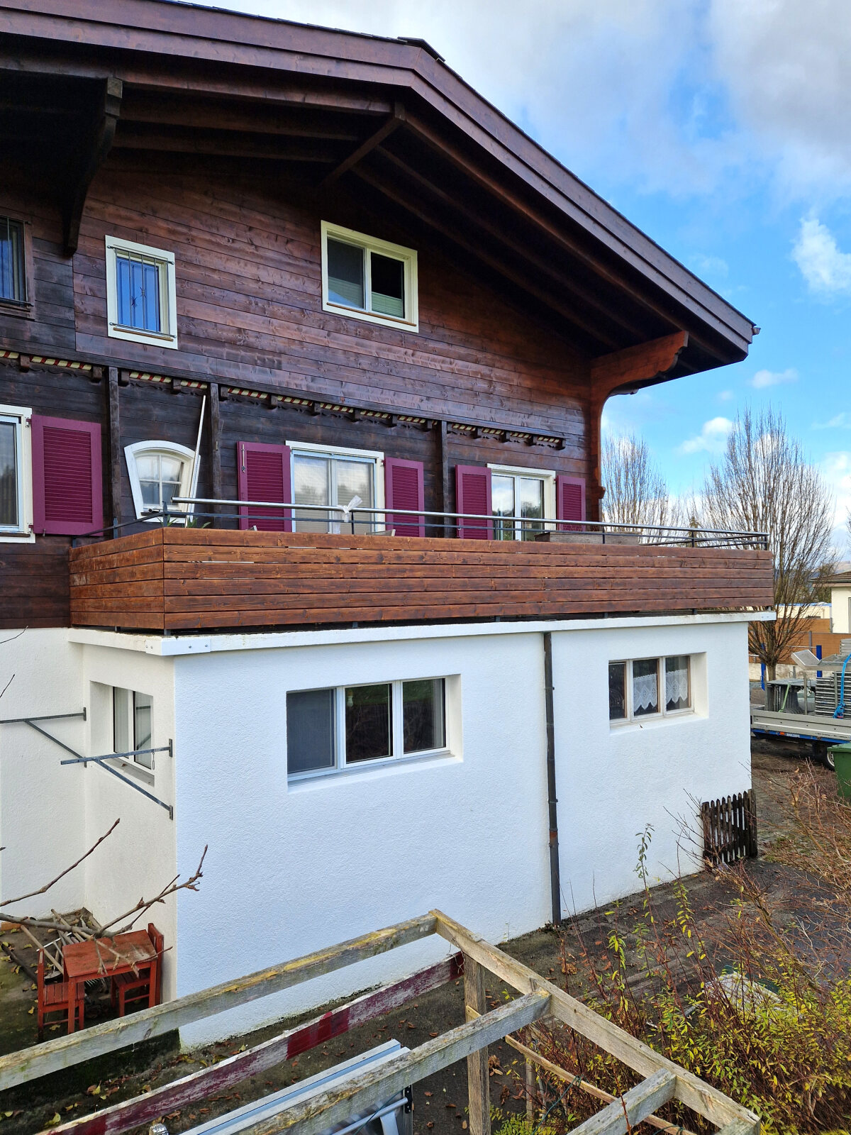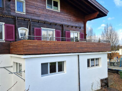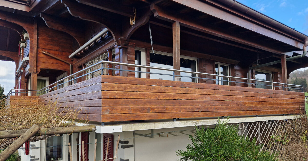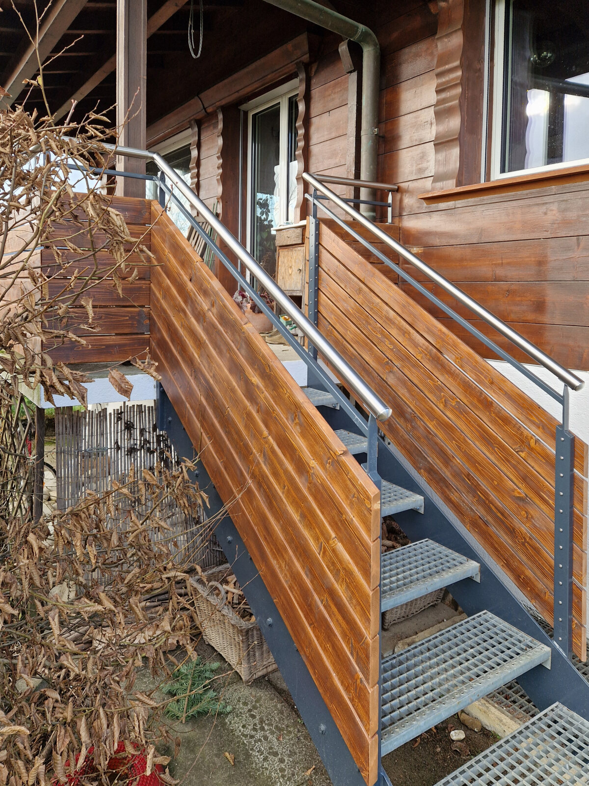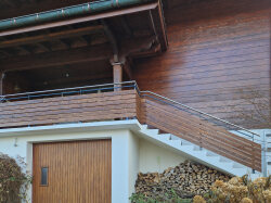 Bei einem bestehenden Einfamilienhaus durften wir das alte Geländer durch eine neue Kombination aus Holz und Metall ersetzen. Der Handlauf besteht aus hochwertigem Chromstahlrohr, kombiniert mit gemalten Fichte-Rhombus-Holzlatten, die dem Geländer eine warme, natürliche Optik verleihen.
