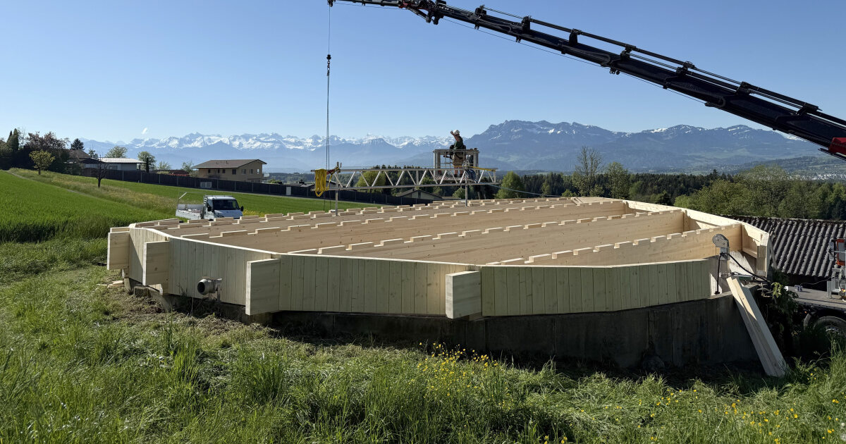 Heute durften wir ein bestehendes Betonsilo mit einem Durchmesser von 14 Metern mit einer Abdeckung ausstatten. Unsere Holz-Konstruktion überzeugt mit Sandwichblech oben und GFK unten (leichter Werkstoff, mit hoher Festigkeit und Formstabilität, witterungsbeständig, nicht rostend).