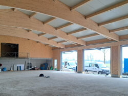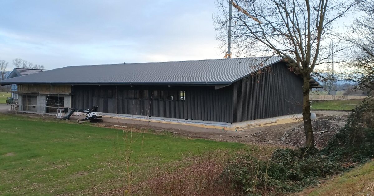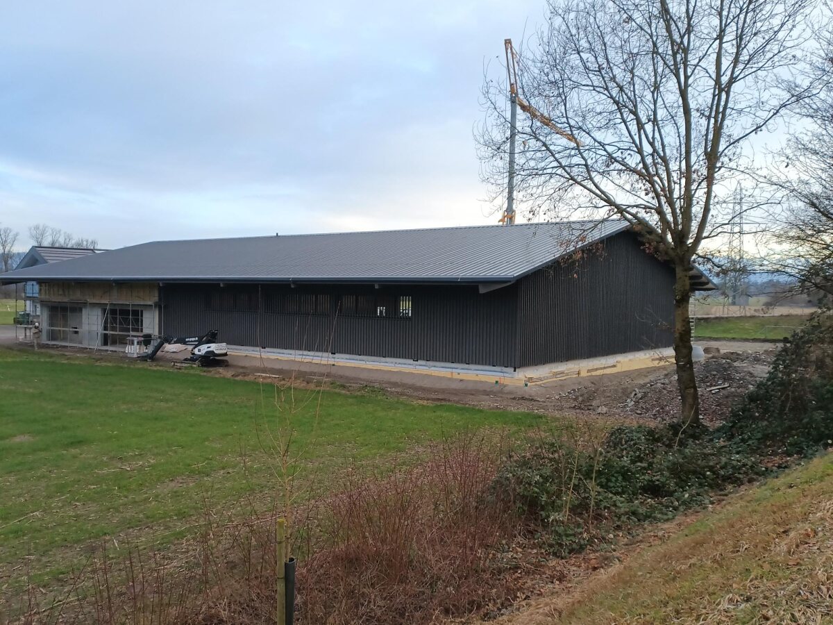 Die Arbeiten an unserer landwirtschaftlichen Halle schreiten in grossen Schritten voran! Die erste Etappe, eine etwa 12 Meter lange Sektion, wurde erfolgreich fertiggestellt. Hierbei konnten wir die Sandwichbleche montieren und die Aufrichtarbeiten planmässig abschliessen.