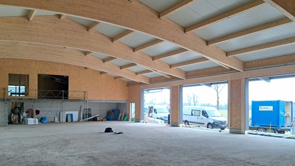 Die Aufrichtearbeiten der zweiten Etappe gehen voran: die Binder für die stützenfreie Halle werden montiert. Mit einem Spezialtransport wurden die Binder von der Firma Hüsser Holzleimbau auf die Baustelle geliefert. Damit die grossen Holzträger versetzt werden können, wurde ein zusätzlicher LKW-Kran benötigt, da die Traglast des Baustellenkrans zu niedrig war. Die Aussenwände sind mit der Fassadenschalung versehen, damit die Bauzeit vor Ort verringert werden kann.