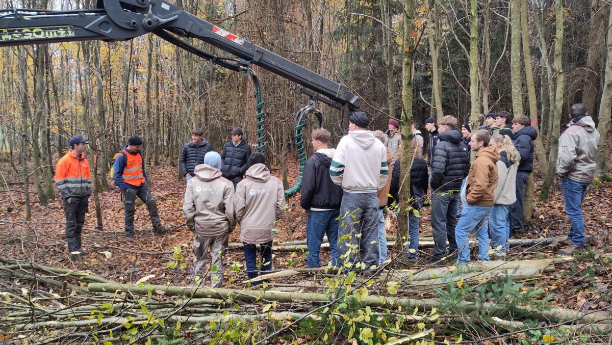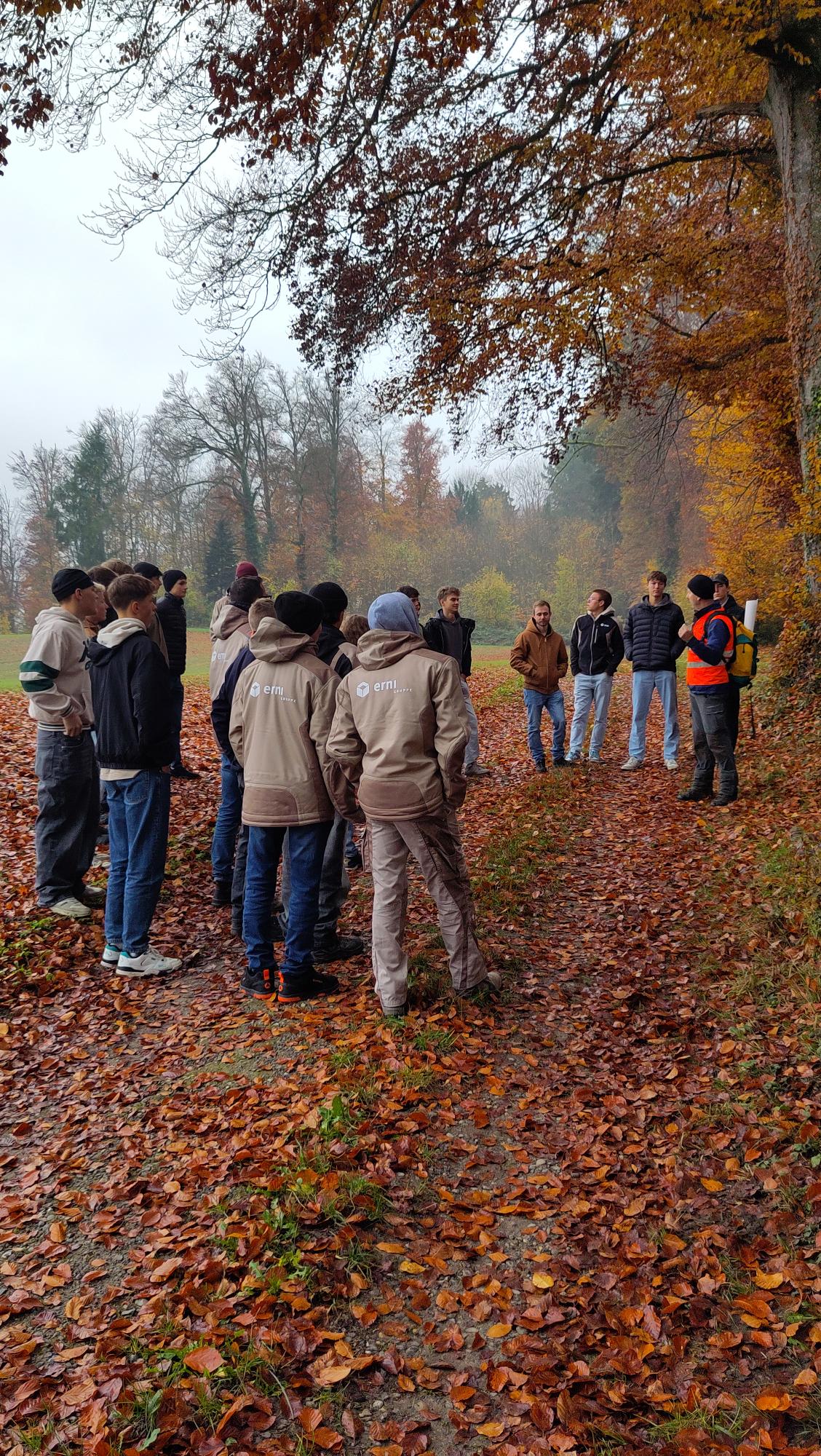 Der Vormittag führte uns in den Wald von Muri – und mitten hinein in die Welt der nachhaltigen Forstwirtschaft. Stefan Staubli zeigte uns mit viel Humor und fundiertem Wissen, wie ein Wald gepflegt werden muss, damit daraus hochwertiges Bauholz entstehen kann. Wir erfuhren Spannendes über den Einfluss des Klimawandels, über Schädlinge, Nutzungsarten des Waldes und die Klassifizierung von Holz. Ein echtes Highlight war die Vorführung eines Vollernters – beeindruckend, wie präzise diese Maschine riesige Bäume fällt und verarbeitet!