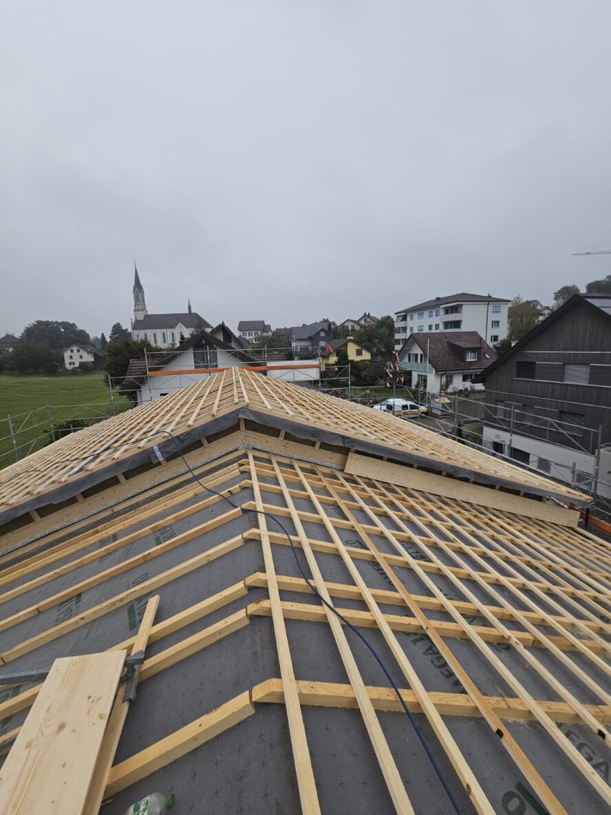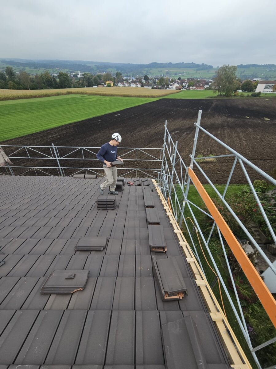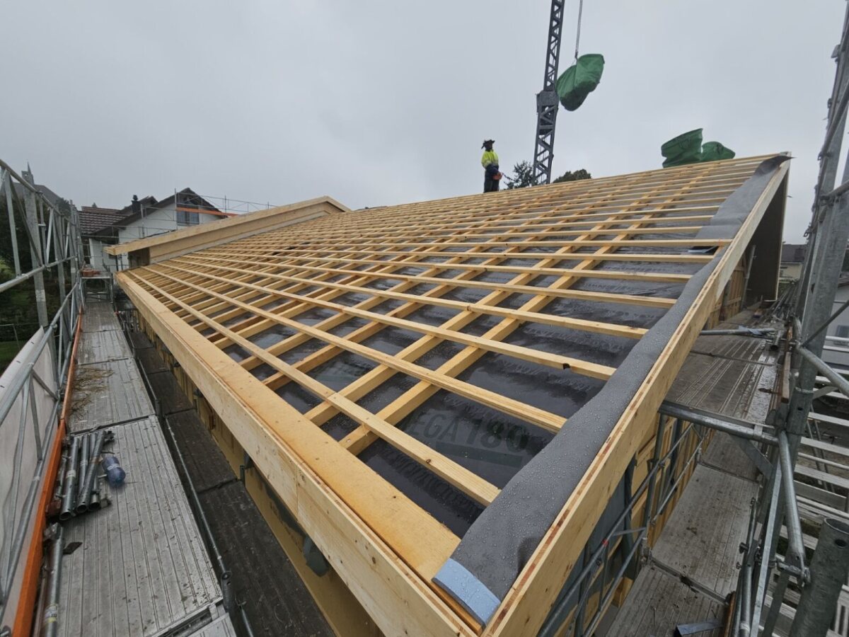 Wir sind aktuell dabei, beim Doppeleinfamilienhaus in Bünzen das Dach einzudecken. Die Unterkonstruktion ist bereits abgeschlossen, und nun wird die Eindeckung Stück für Stück umgesetzt. Die Arbeiten verlaufen zügig, und das Dach nimmt zunehmend Form an.