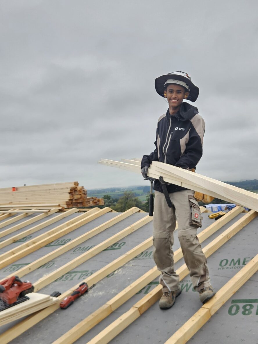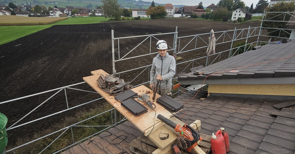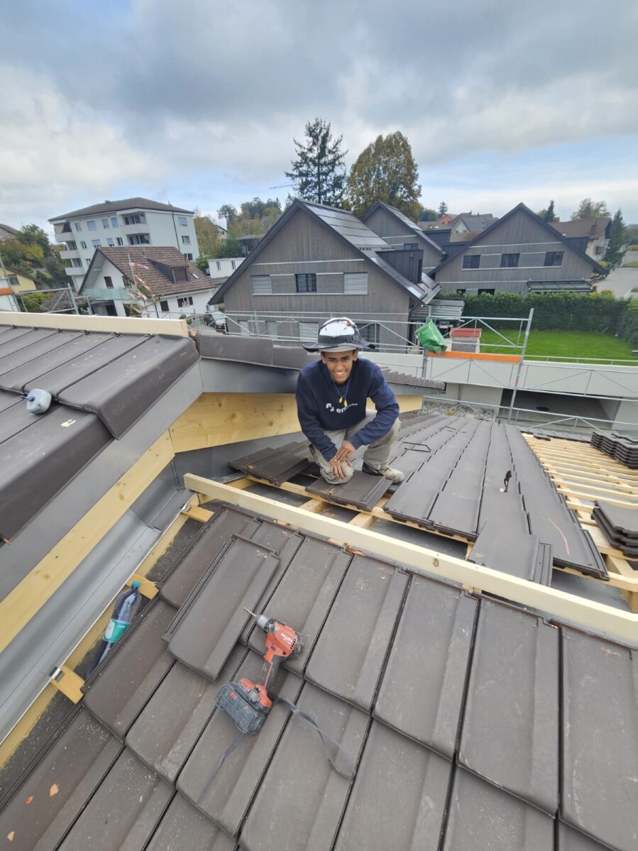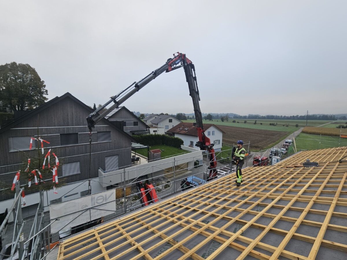 Wir sind aktuell dabei, beim Doppeleinfamilienhaus in Bünzen das Dach einzudecken. Die Unterkonstruktion ist bereits abgeschlossen, und nun wird die Eindeckung Stück für Stück umgesetzt. Die Arbeiten verlaufen zügig, und das Dach nimmt zunehmend Form an.