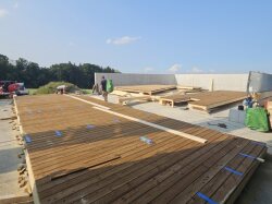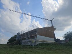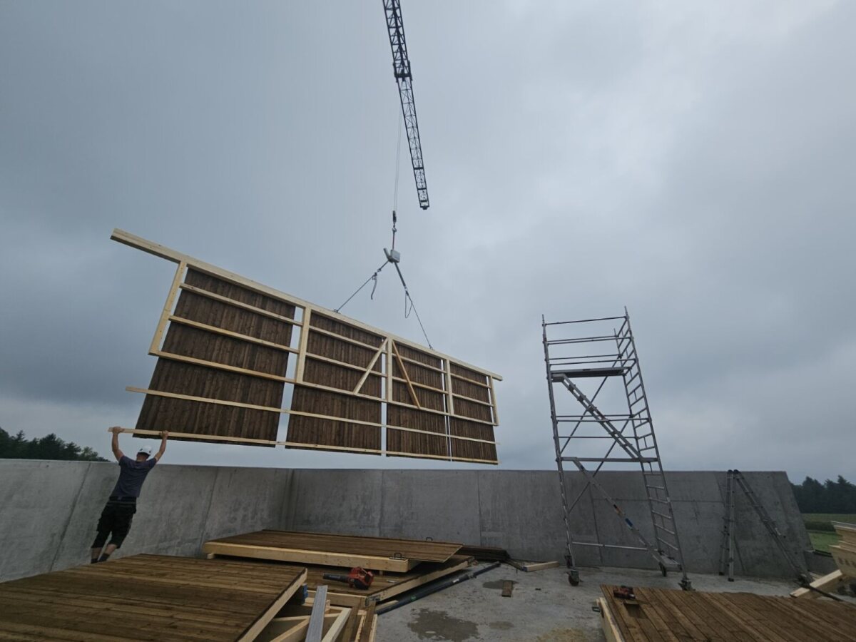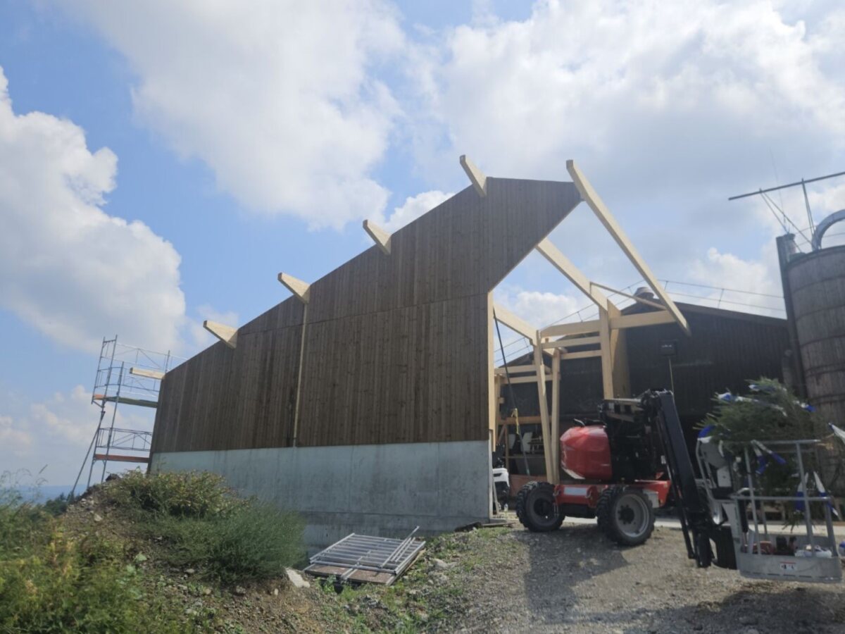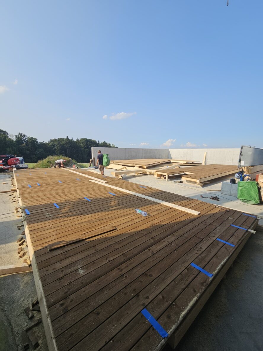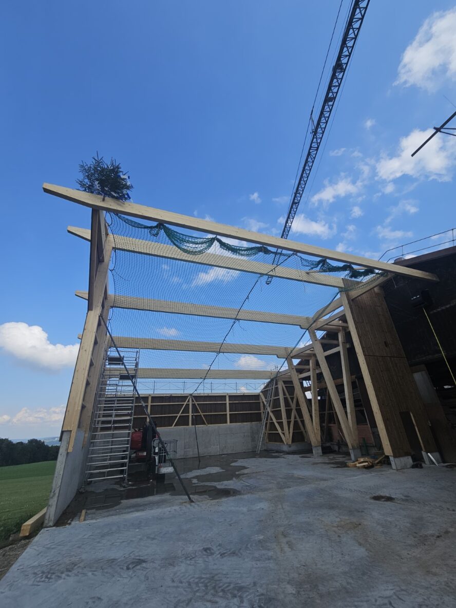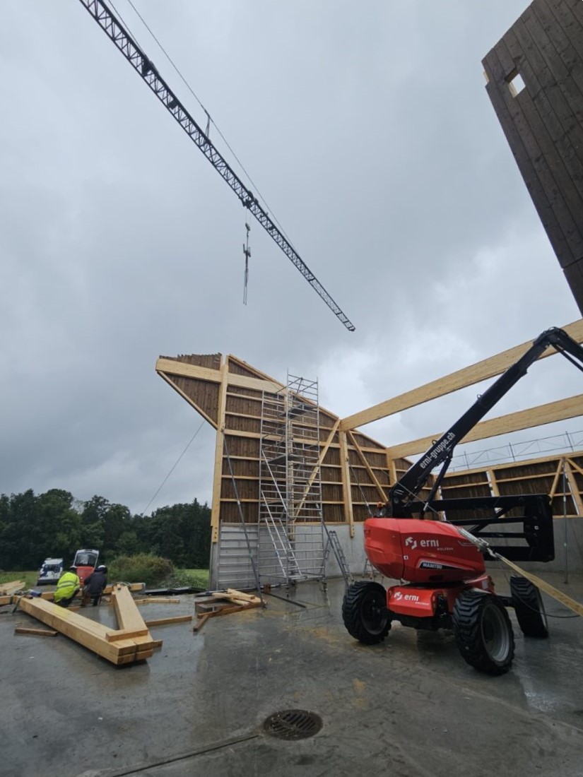 Wir freuen uns, die Ausführung der Remise in Boswil übernehmen zu dürfen. Die Aufrichtarbeiten sind bereits in vollem Gange: Die Wände wurden vor Ort gefertigt und anschliessend aufgerichtet. Auch die Dachbinder sind bereits angebracht – das Bauwerk nimmt Schritt für Schritt Gestalt an.