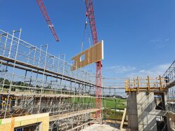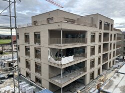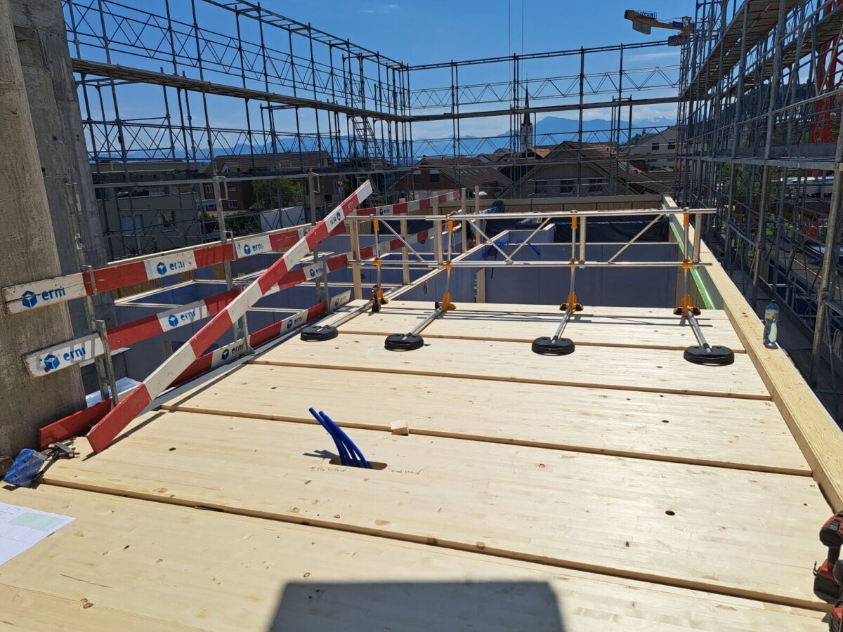 In Mühlau entsteht derzeit die Wohnüberbauung "Roggächer", und wir freuen uns, dieses Projekt als ausführendes Holzbauunternehmen begleiten zu dürfen. Aktuell sind wir mit dem Aufrichten des Erdgeschosses beschäftigt. Die BSH-Böden wurden bereits eingerichtet, und das Gebäude wurde präzise mit dem Tachymeter vermessen. Auch die Innenwände werden zurzeit gestellt.