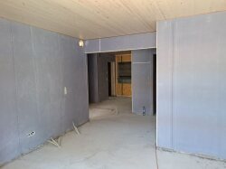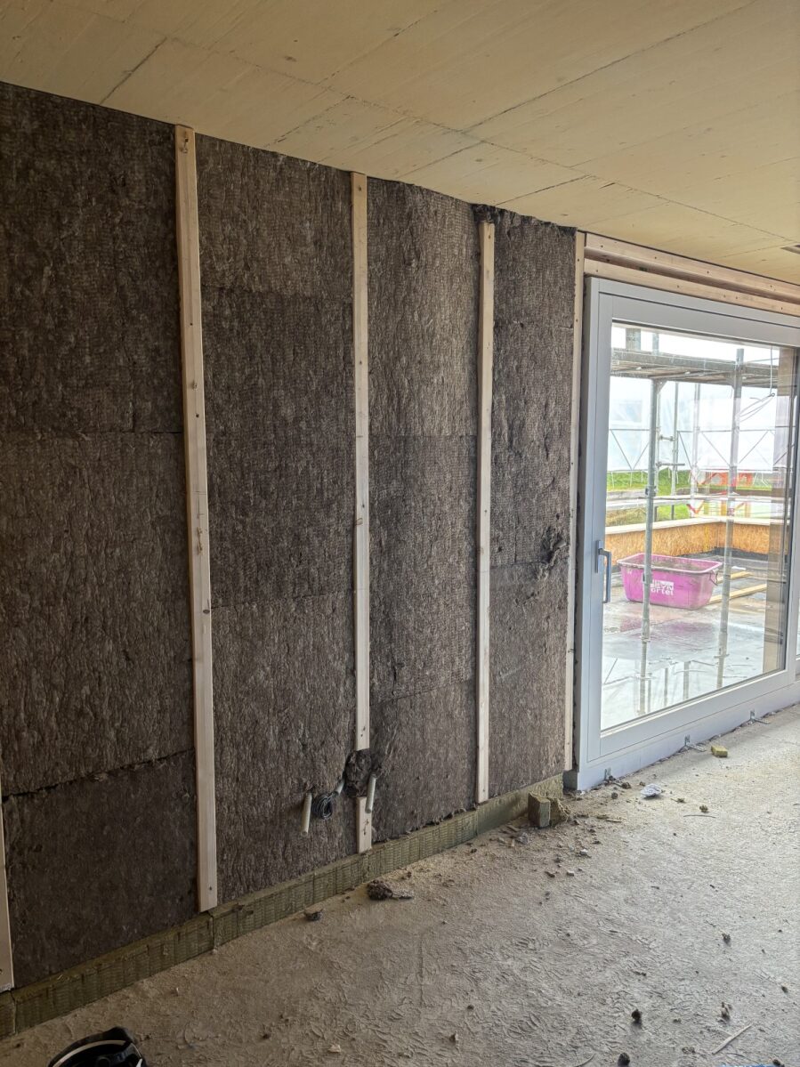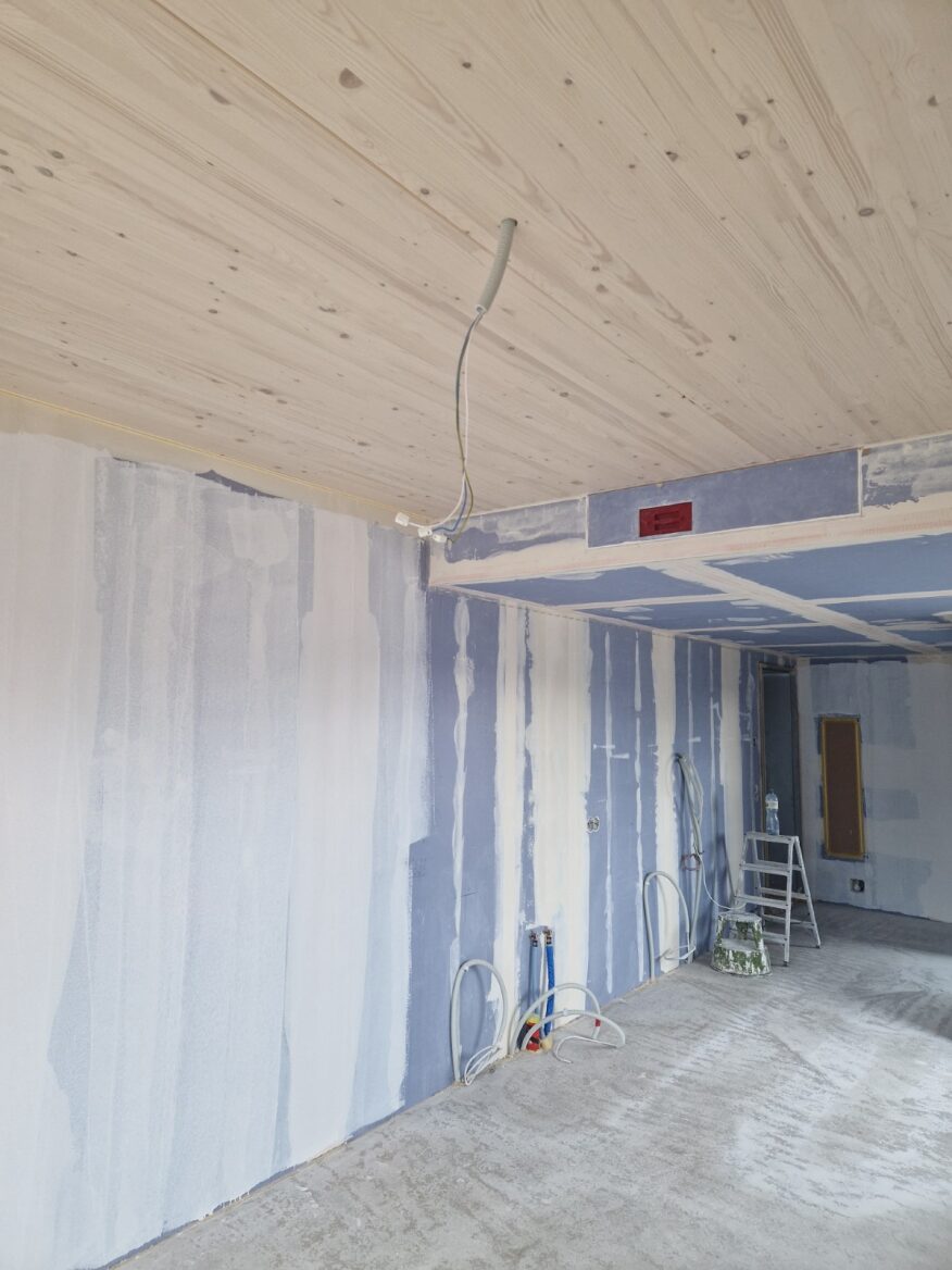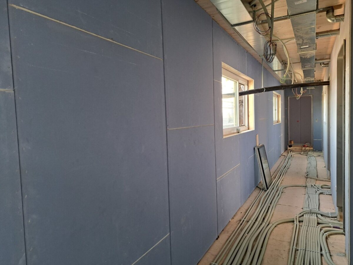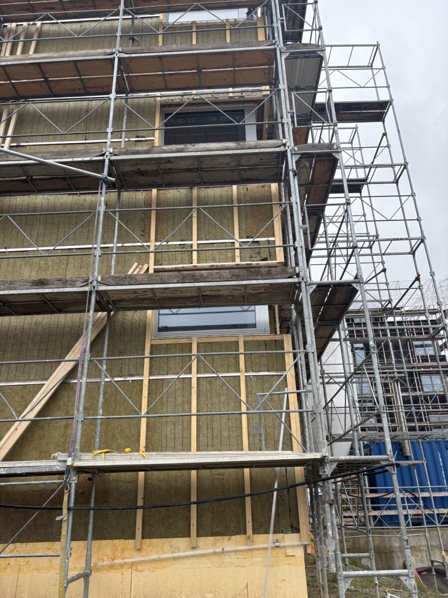 Der Innenausbau am ersten Haus ist abgeschlossen. Die abgehängten Decken aus Gipsfaserplatten wurden bereits erstellt. Aussen beginnen wir nun mit den Fassadenarbeiten. Im Erdgeschoss, das in Massivbauweise errichtet ist, dämmen wir derzeit die Fassade und erstellen die Unterkonstruktion für die vorgehängte Fassade.
