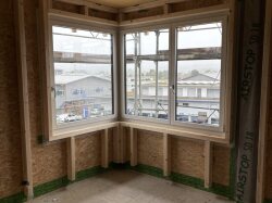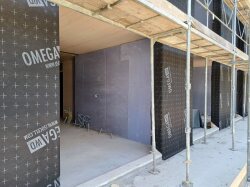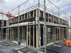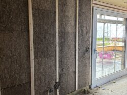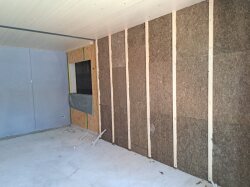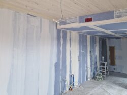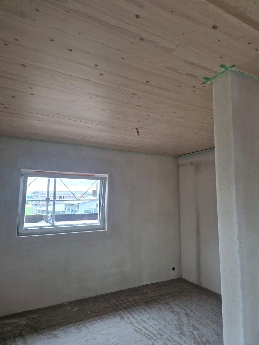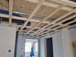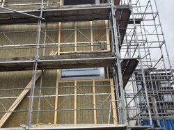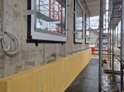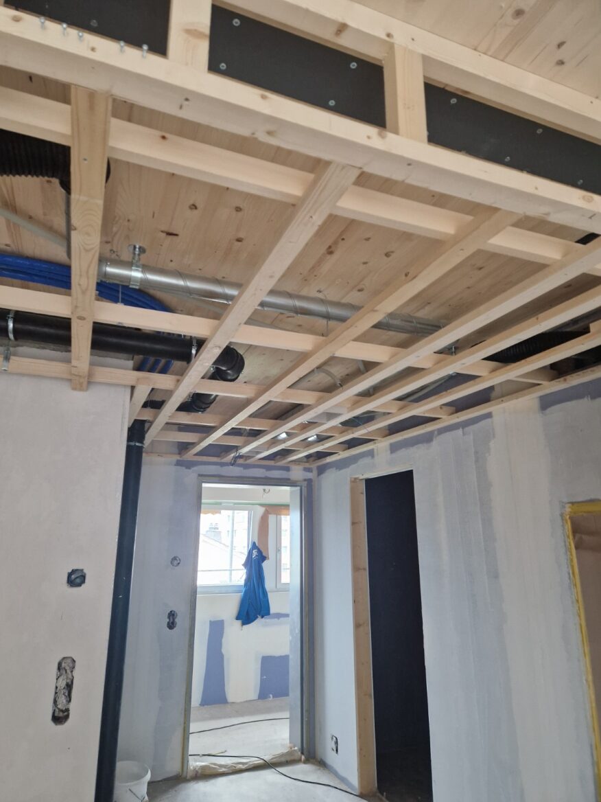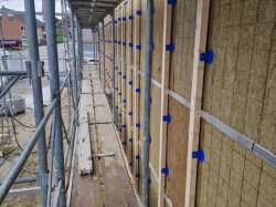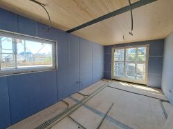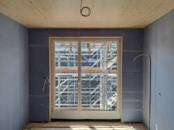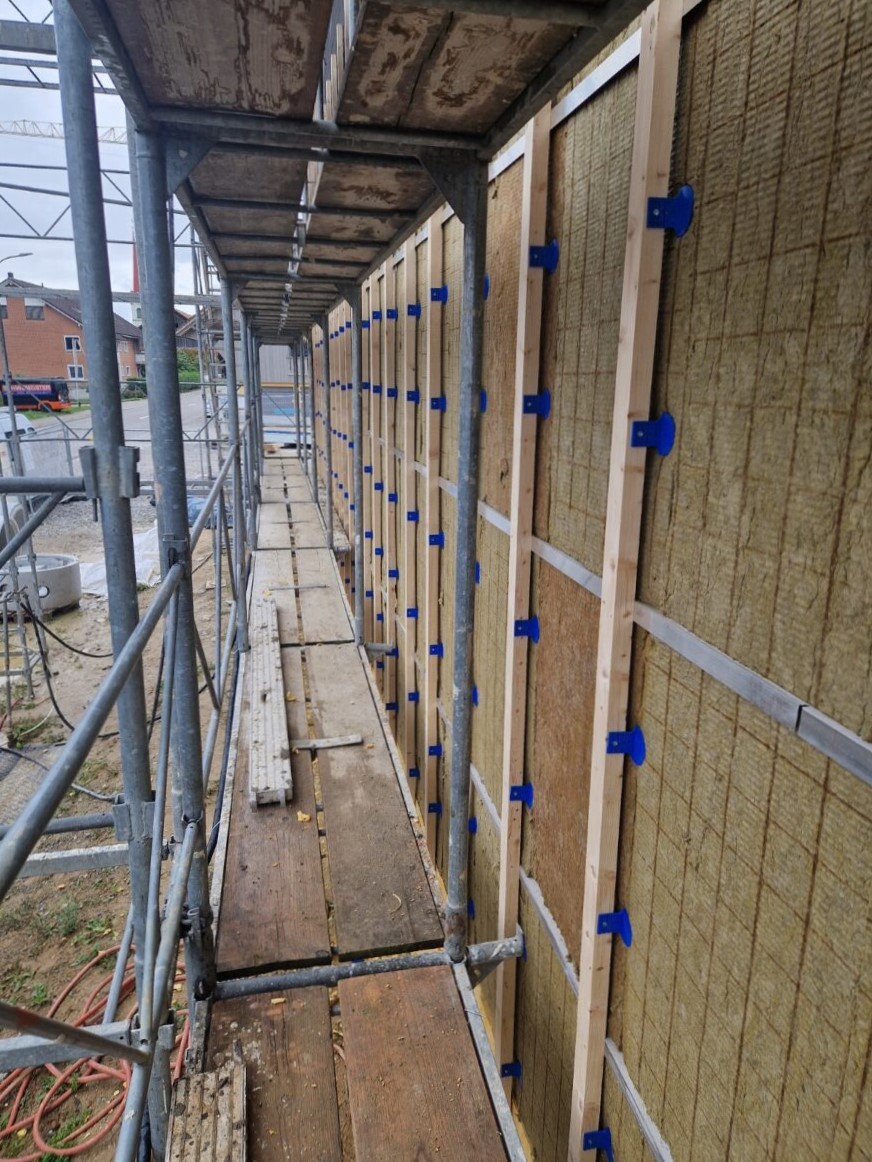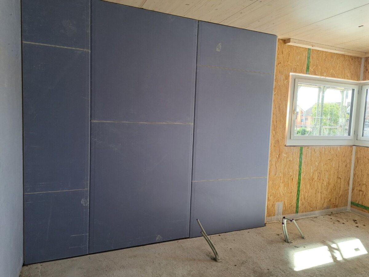 Der Innenausbau am ersten Haus ist abgeschlossen. Die abgehängten Decken aus Gipsfaserplatten wurden bereits erstellt. Aussen beginnen wir nun mit den Fassadenarbeiten. Im Erdgeschoss, das in Massivbauweise errichtet ist, dämmen wir derzeit die Fassade und erstellen die Unterkonstruktion für die vorgehängte Fassade.