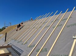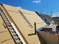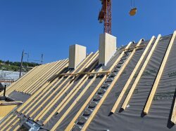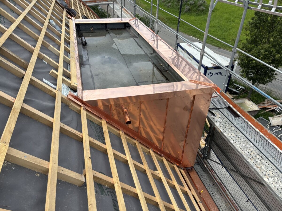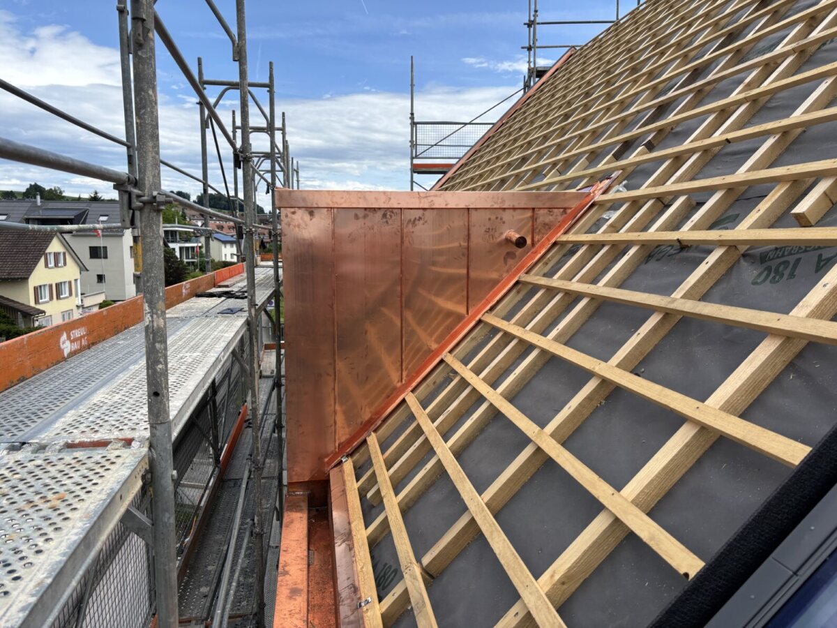 Auf der Baustelle in Mettmenstetten haben wir folgende Arbeiten ausgeführt: Montage des Lüftungsschachts, Montage der Konterlatten sowie das Schliessen der Dachelementstösse.