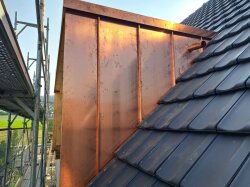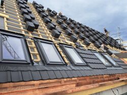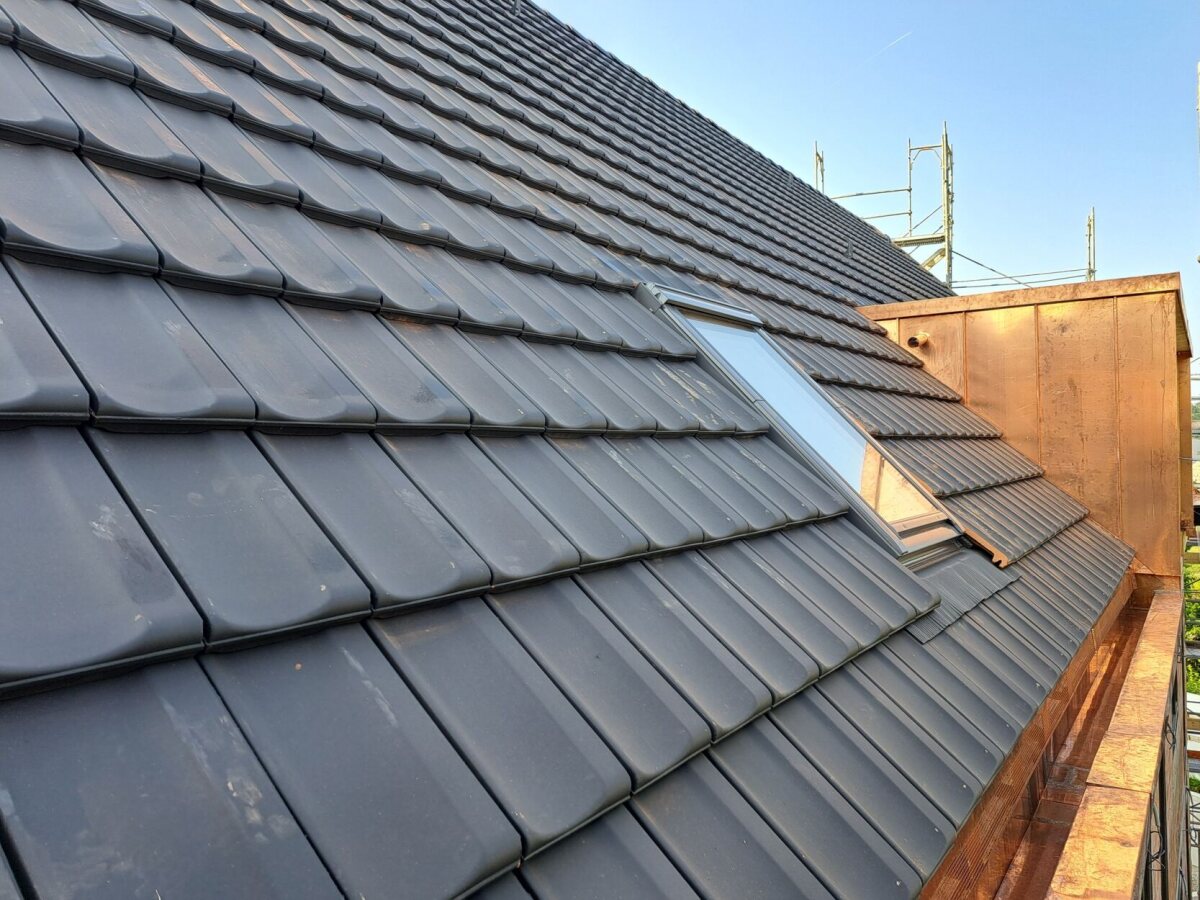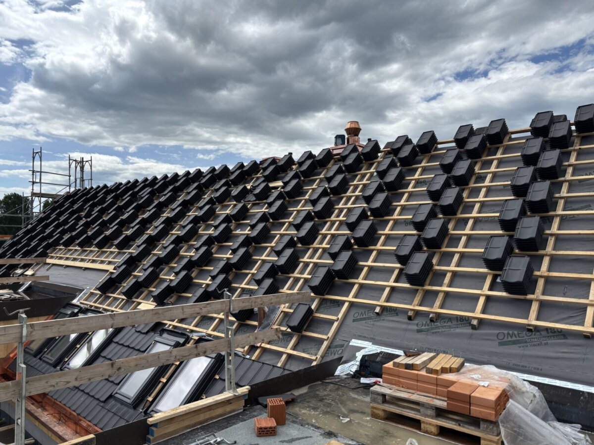 Wir haben nun die Stahlzargen montiert, die Lukarnen verkleidet und im Zuge dessen die Dacheindeckung ausgeführt. Auch kamen wir in