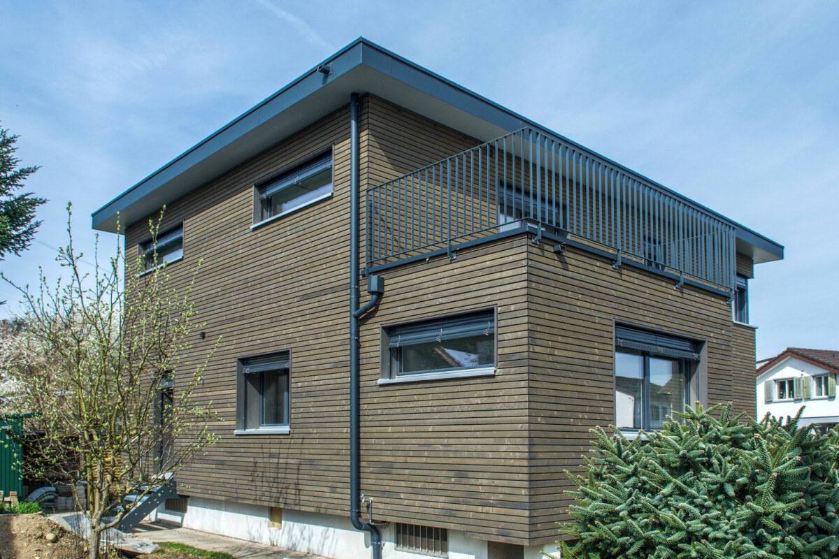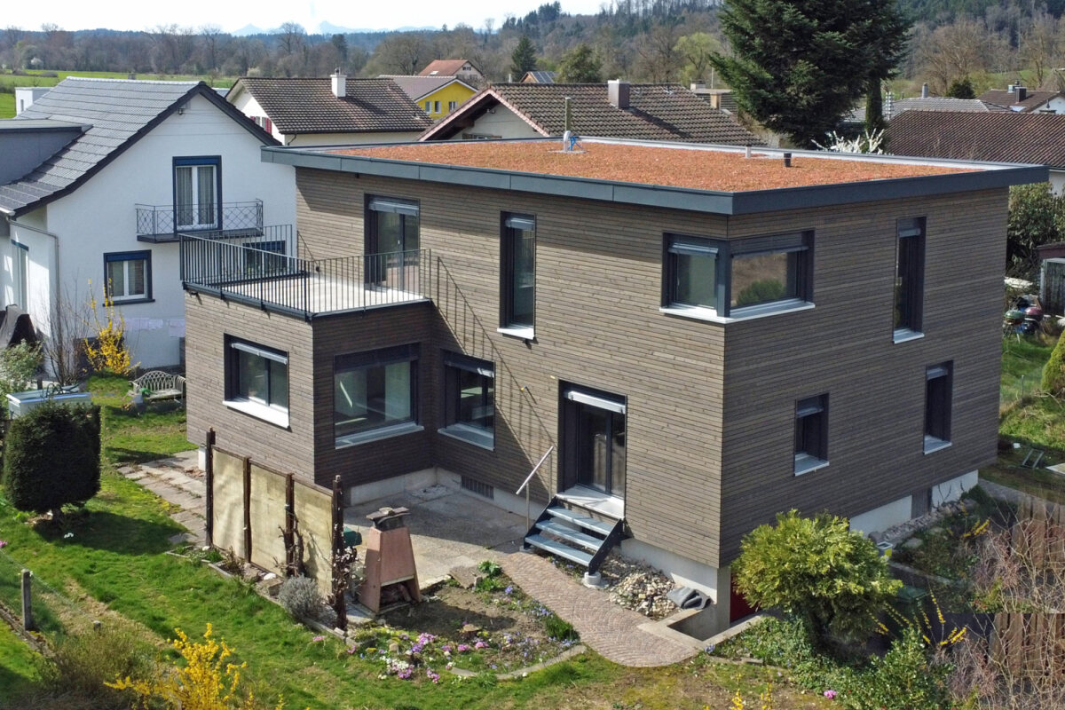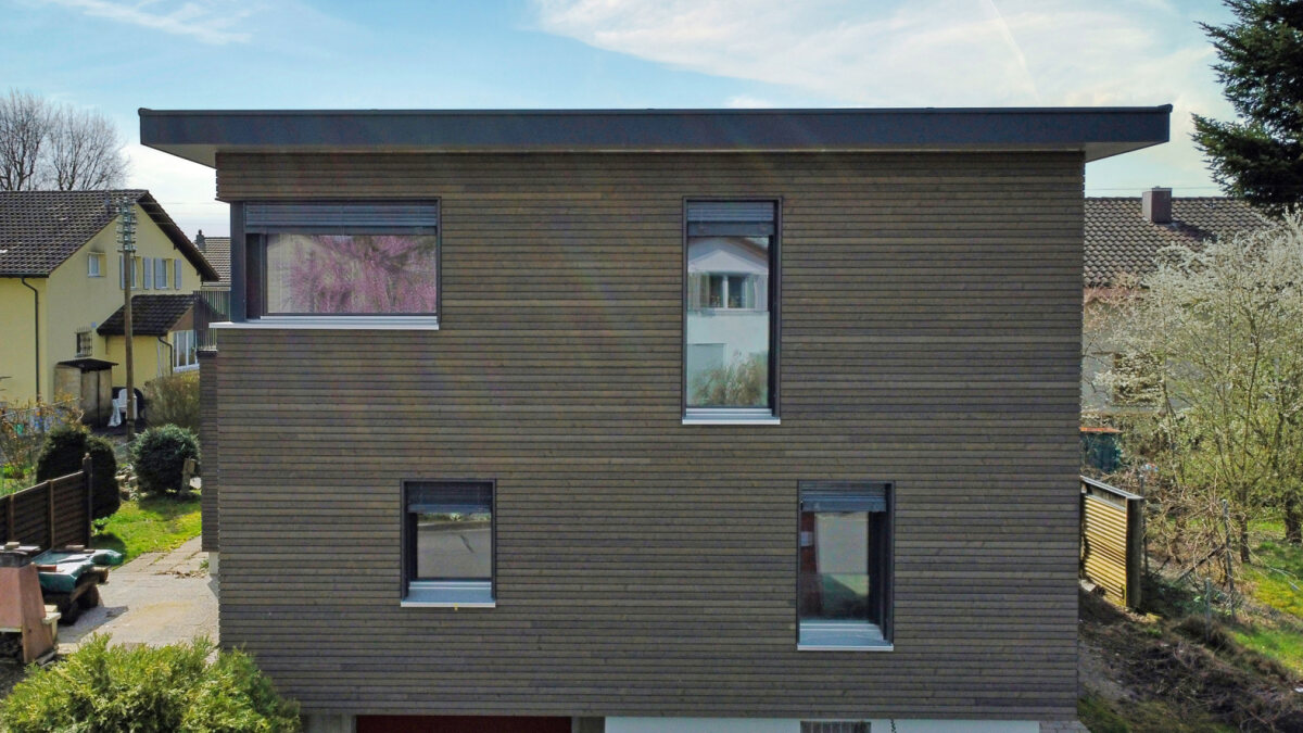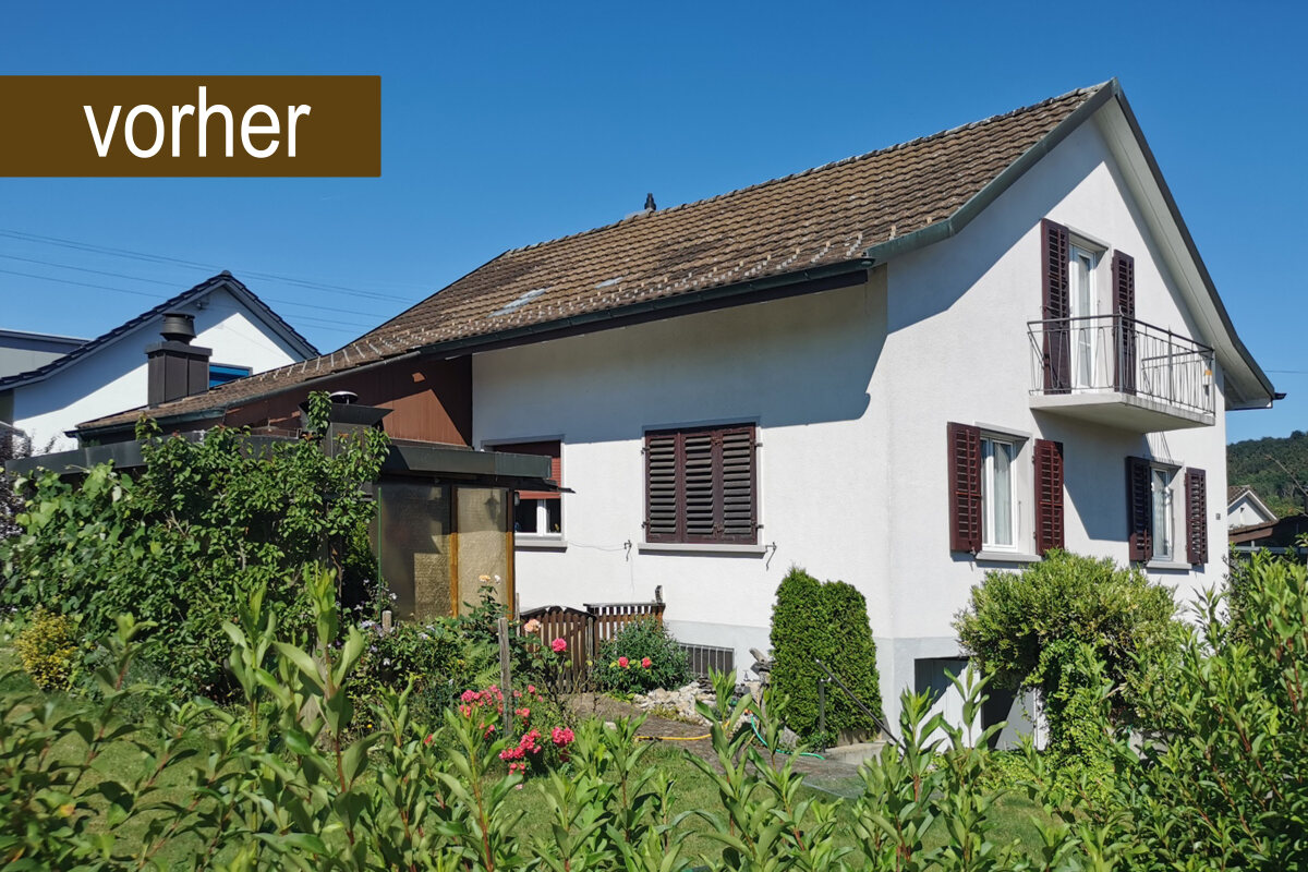 Durch die Modernisierung ist ein zeitgemässes und stilvolles Einfamilienhaus entstanden. Dank der Aufstockung mit einem Flachdach wurde im Obergeschoss eine grosszügige Raumhöhe erreicht und über dem gedeckten Sitzplatz ein neuer Balkon geschaffen. Die Wärmedämmung des Doppelschalenmauer-werks im Erdgeschoss ist mit Einsatz des Rogger-Systems erfolgreich optimiert worden. Die ästhetische Holzfassade vereint die alte und neue Bausubstanz äusserst ansprechend.