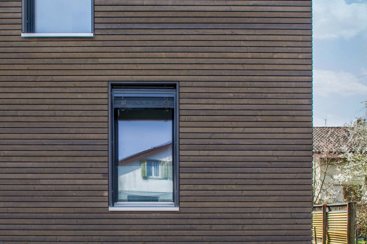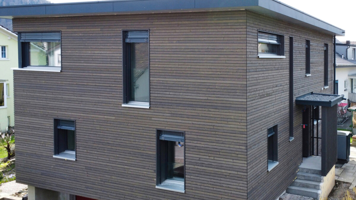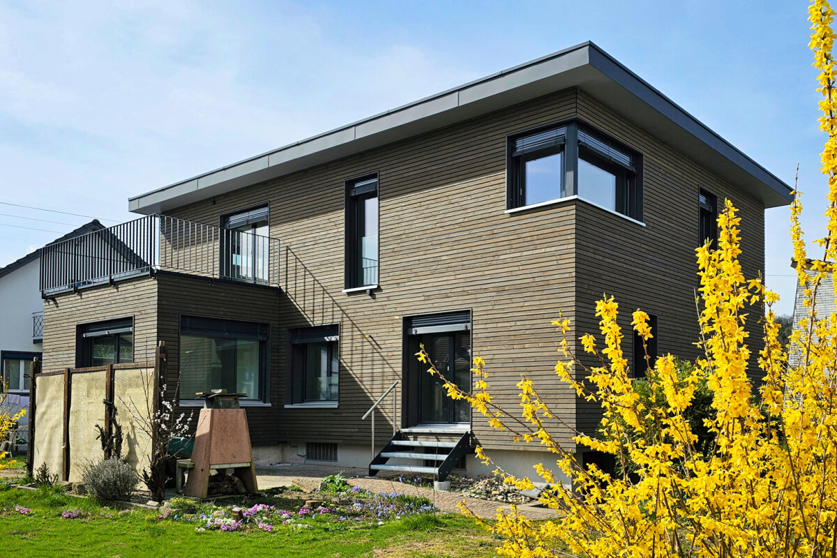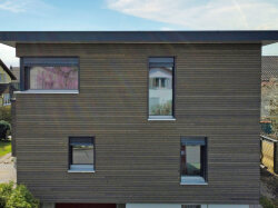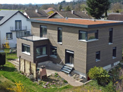 Durch die Modernisierung ist ein zeitgemässes und stilvolles Einfamilienhaus entstanden. Dank der Aufstockung mit einem Flachdach wurde im Obergeschoss eine grosszügige Raumhöhe erreicht und über dem gedeckten Sitzplatz ein neuer Balkon geschaffen. Die Wärmedämmung des Doppelschalenmauer-werks im Erdgeschoss ist mit Einsatz des Rogger-Systems erfolgreich optimiert worden. Die ästhetische Holzfassade vereint die alte und neue Bausubstanz äusserst ansprechend.
