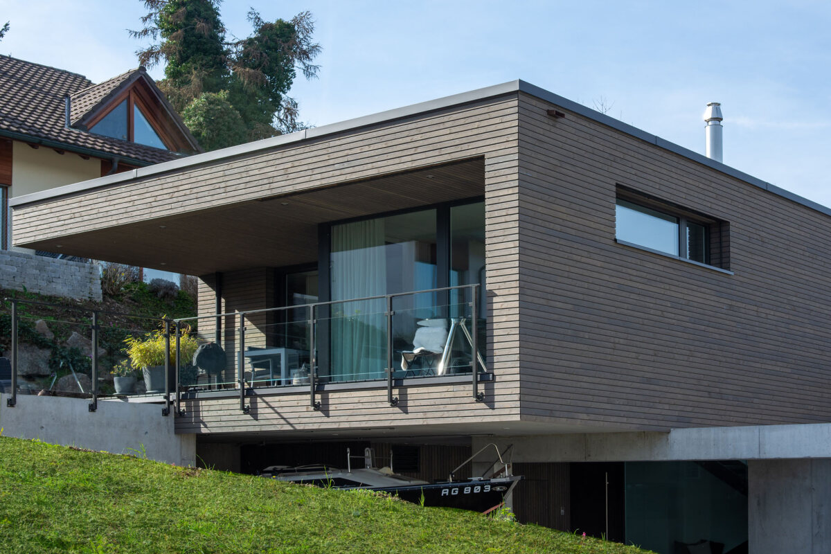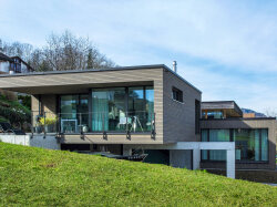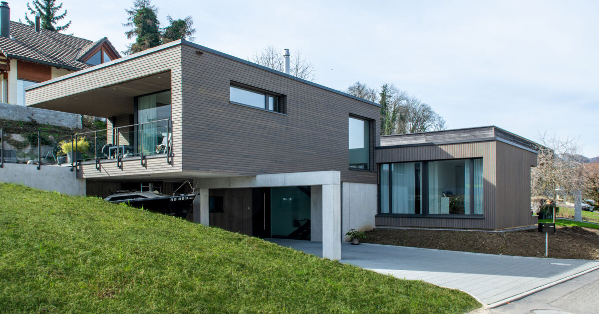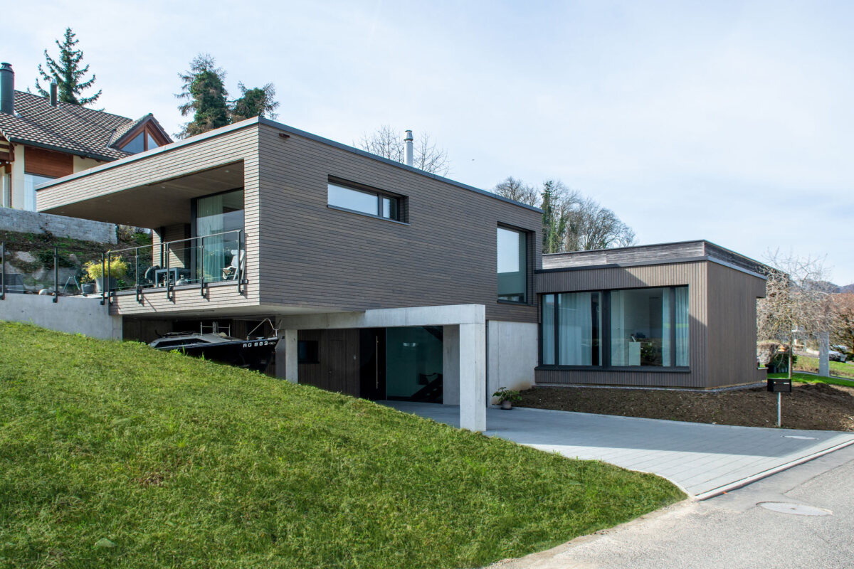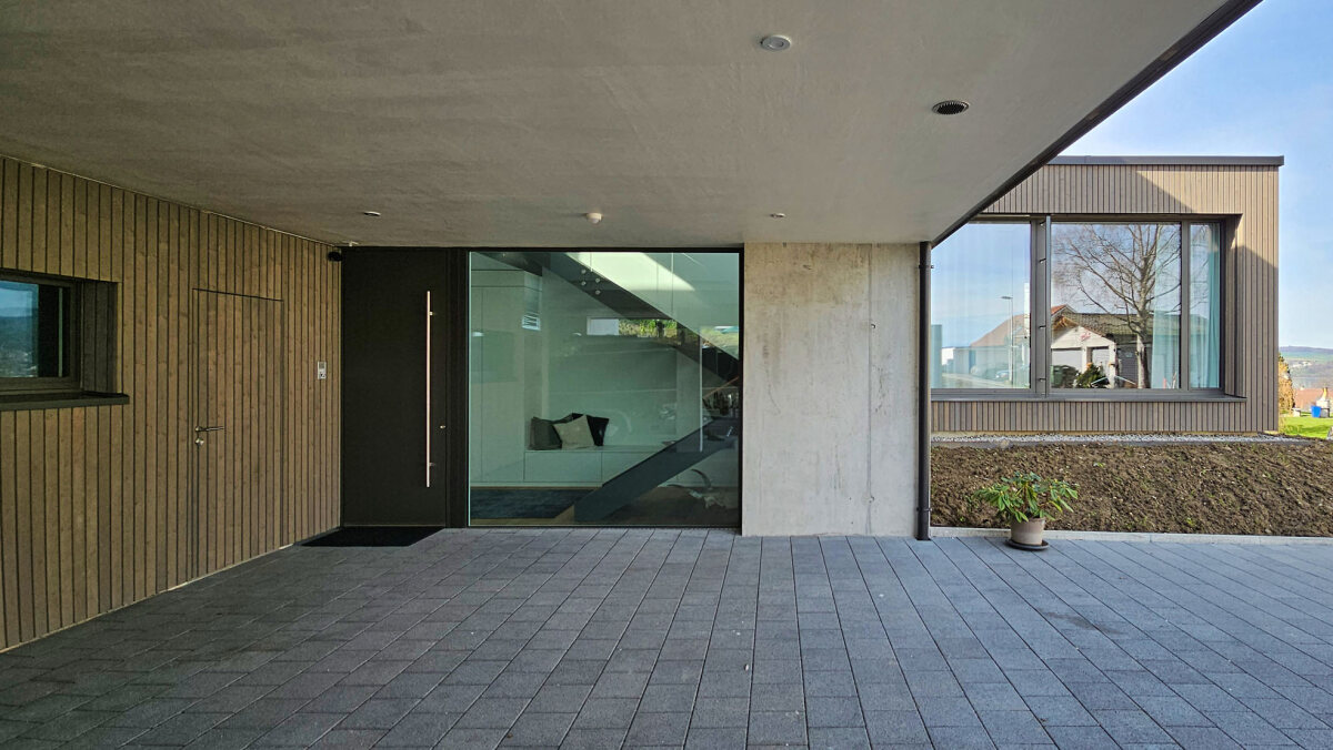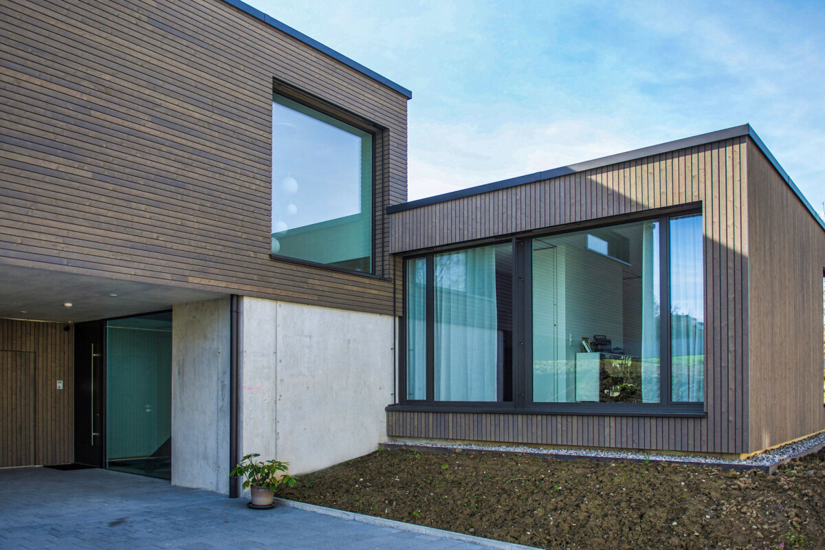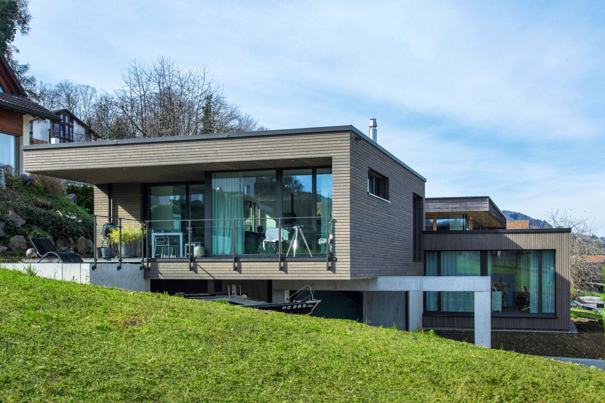 Auffällig sind die grossen Verglasungen, die das ganze Gebäude mit Licht durchfluten. Die aussergewöhnliche Architektur verleiht dem Einfamilienhaus seinen eigenen Charakter.