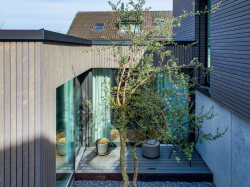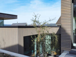 Das Gebäude besteht aus zwei Kuben, die um ein halbes Stockwerk versetzt sind. Im rechten unteren Teil befinden sich Schlaf- und Badezimmer sowie die eigene kleine Wellnessoase mit Sauna und einem Innenhof zur Abkühlung. Im oberen Teil liegt der Wohn- und Essbereich.