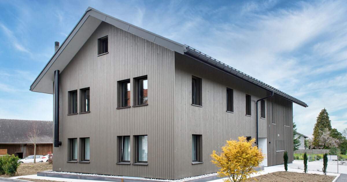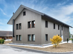 Das ehemalige Haus mit Schopfanbau wurde komplett abgerissen und hat Platz geschaffen für das neue Wohnhaus. Das Gebäude besitzt im Erdgeschoss eine Einlieger-Wohnung. Bis und mit Erdgeschoss ist das Gebäude in Massivbauweise ausgeführt. Die Wände OG bis und mit Dach sind in Holzelementbau gefertigt worden. Richtung Norden ist der von aussen leicht abgesetzte Schopfteil des Gebäudes. Mit der Änderung der Schalung ist dieser Effekt verstärkt worden. Auf dem Dach ist eine Indach-Solaranlage verbaut worden. Die Innenwände sind abgerieben und die Decke im OG sowie DG sind weiss behandelte 3-Schichtplatten. Der braune Holzboden gibt einen schönen Kontrast und vermittelt ein wohnliches Gefühl.