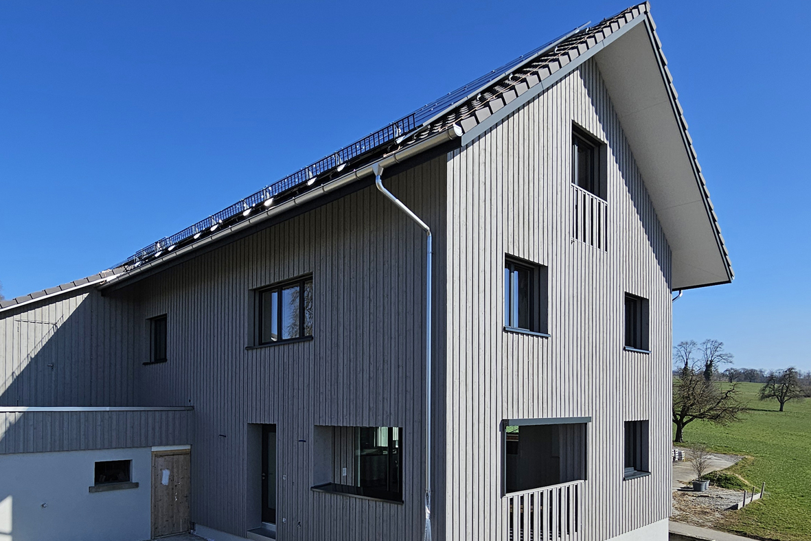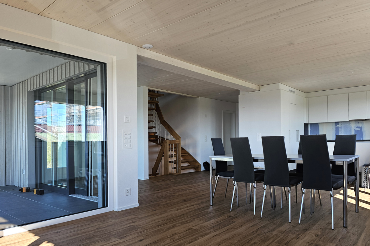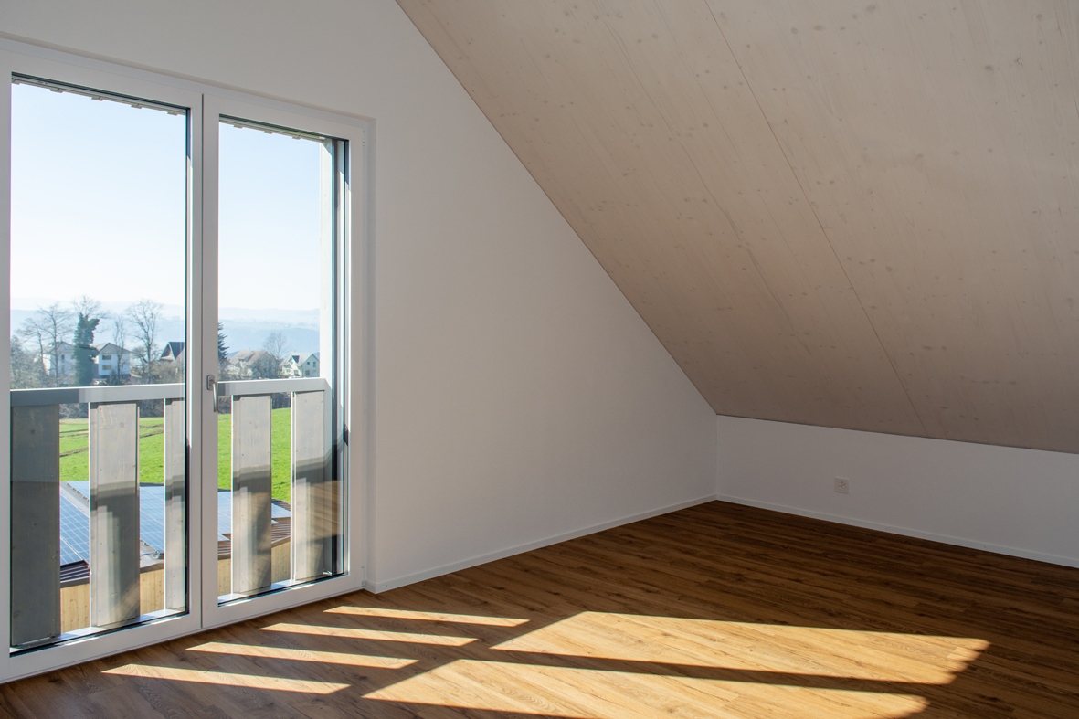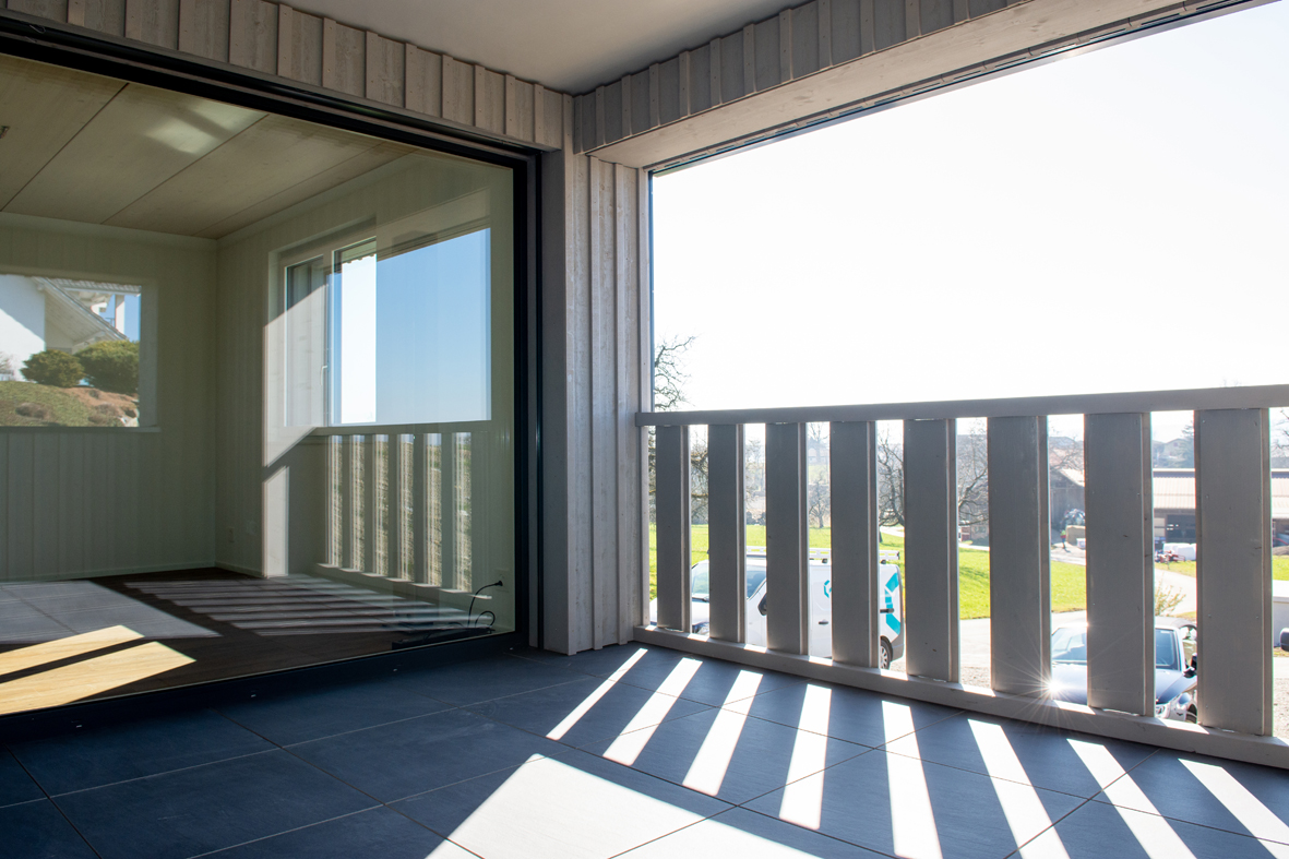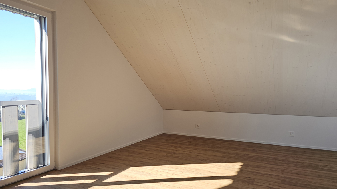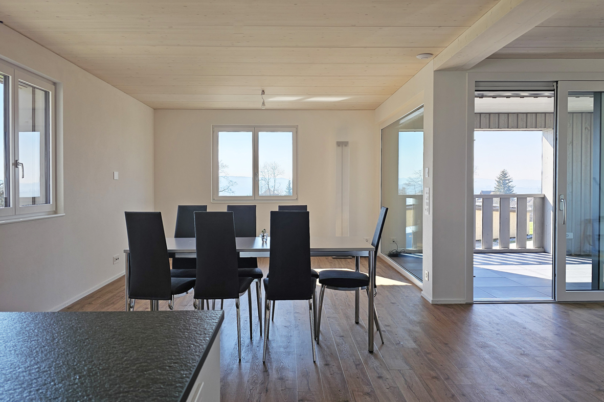 Das Kellergeschoss ist in Massivbauweise errichtet, die weiteren Stockwerke sind aus Holzelementen gefertigt, welche an die bestehende Scheune angepasst wurden. Die integrierte Loggia mit Blick über das ganze Seetal lädt im Erdgeschoss zum Verweilen ein. Die grosszügigen Zimmer in den oberen Geschossen sind sehr hell gestaltet und bieten ausreichend Platz, um sich zurückzuziehen. Ergänzt ist das ganze Gebäude mit einer grossen und leistungsfähigen PV-Anlage.