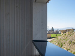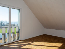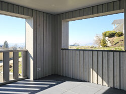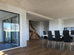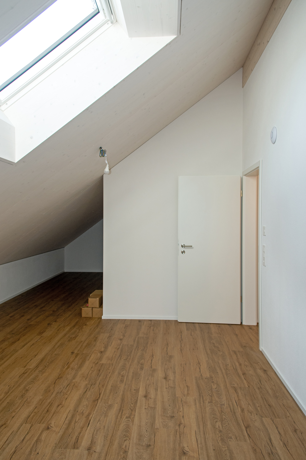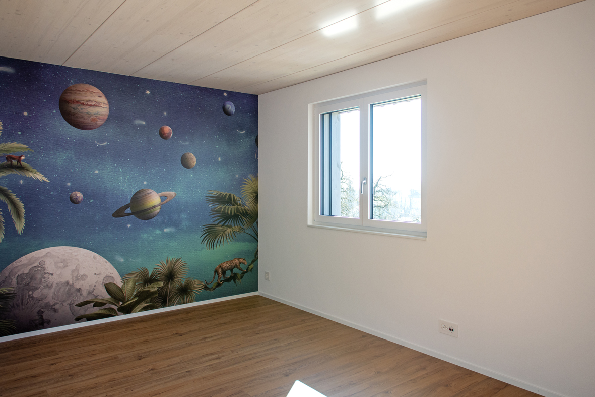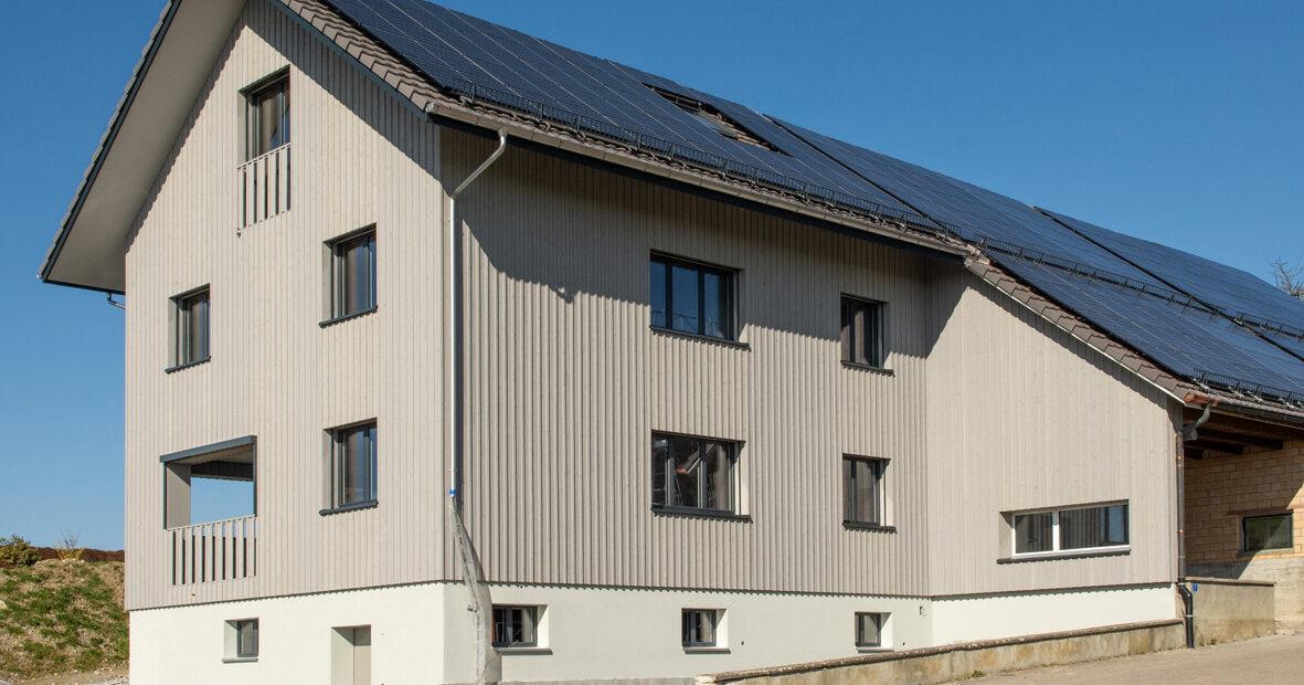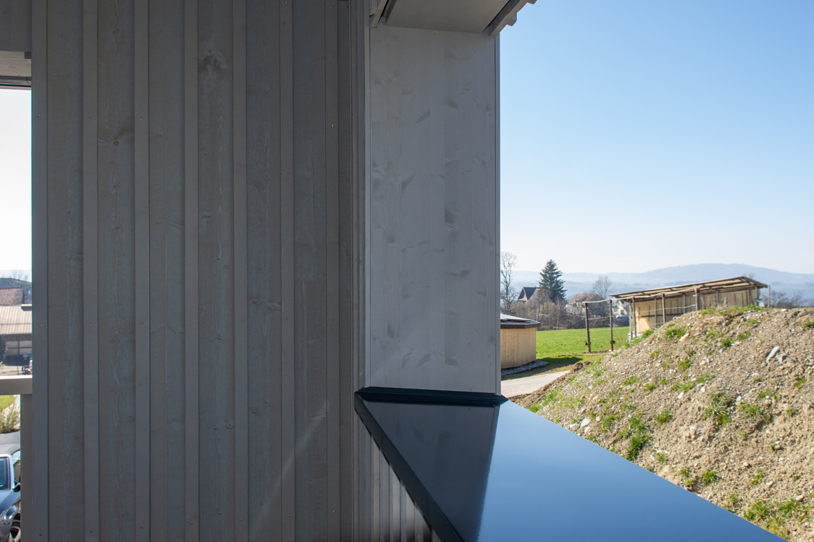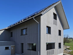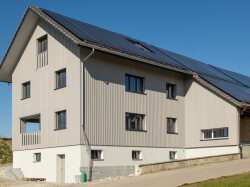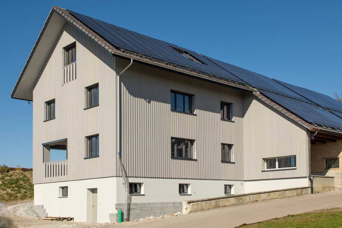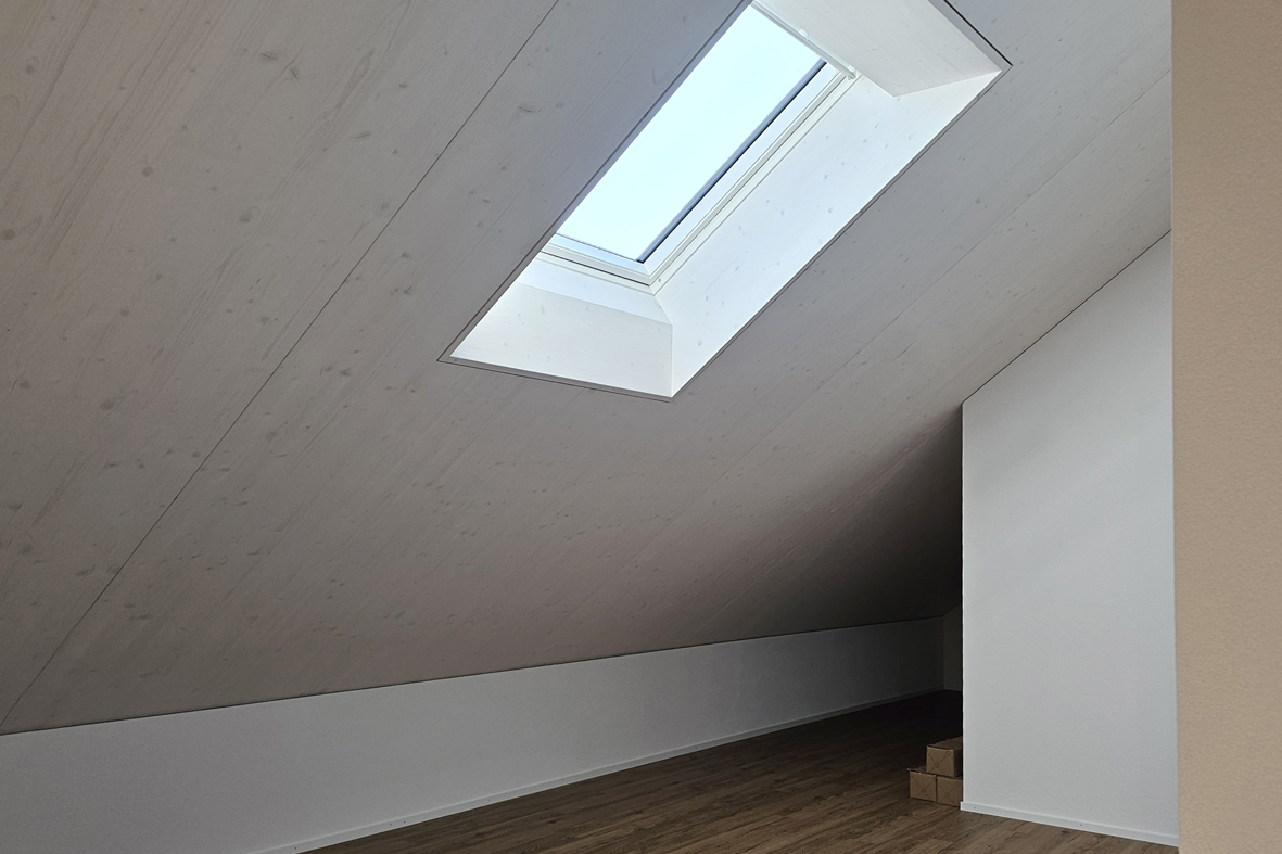Das Kellergeschoss ist in Massivbauweise errichtet, die weiteren Stockwerke sind aus Holzelementen gefertigt, welche an die bestehende Scheune angepasst wurden. Die integrierte Loggia mit Blick über das ganze Seetal lädt im Erdgeschoss zum Verweilen ein. Die grosszügigen Zimmer in den oberen Geschossen sind sehr hell gestaltet und bieten ausreichend Platz, um sich zurückzuziehen. Ergänzt ist das ganze Gebäude mit einer grossen und leistungsfähigen PV-Anlage.