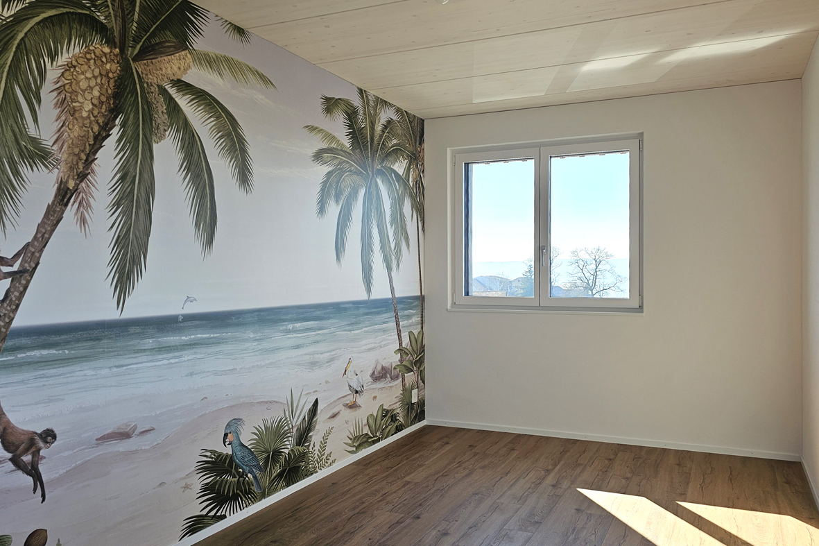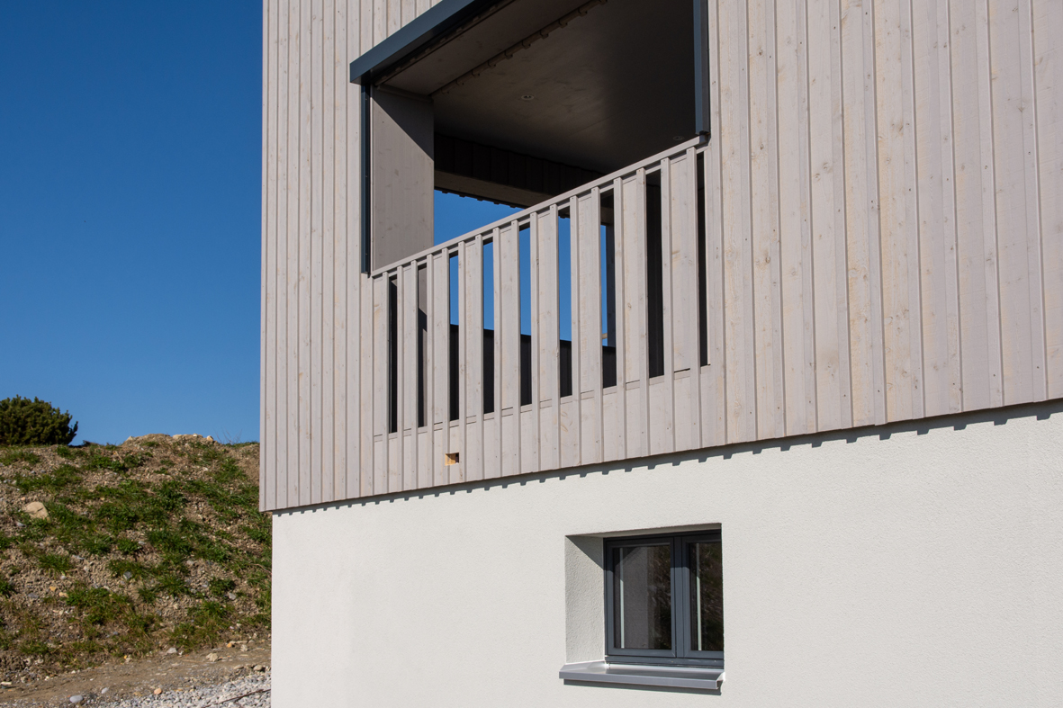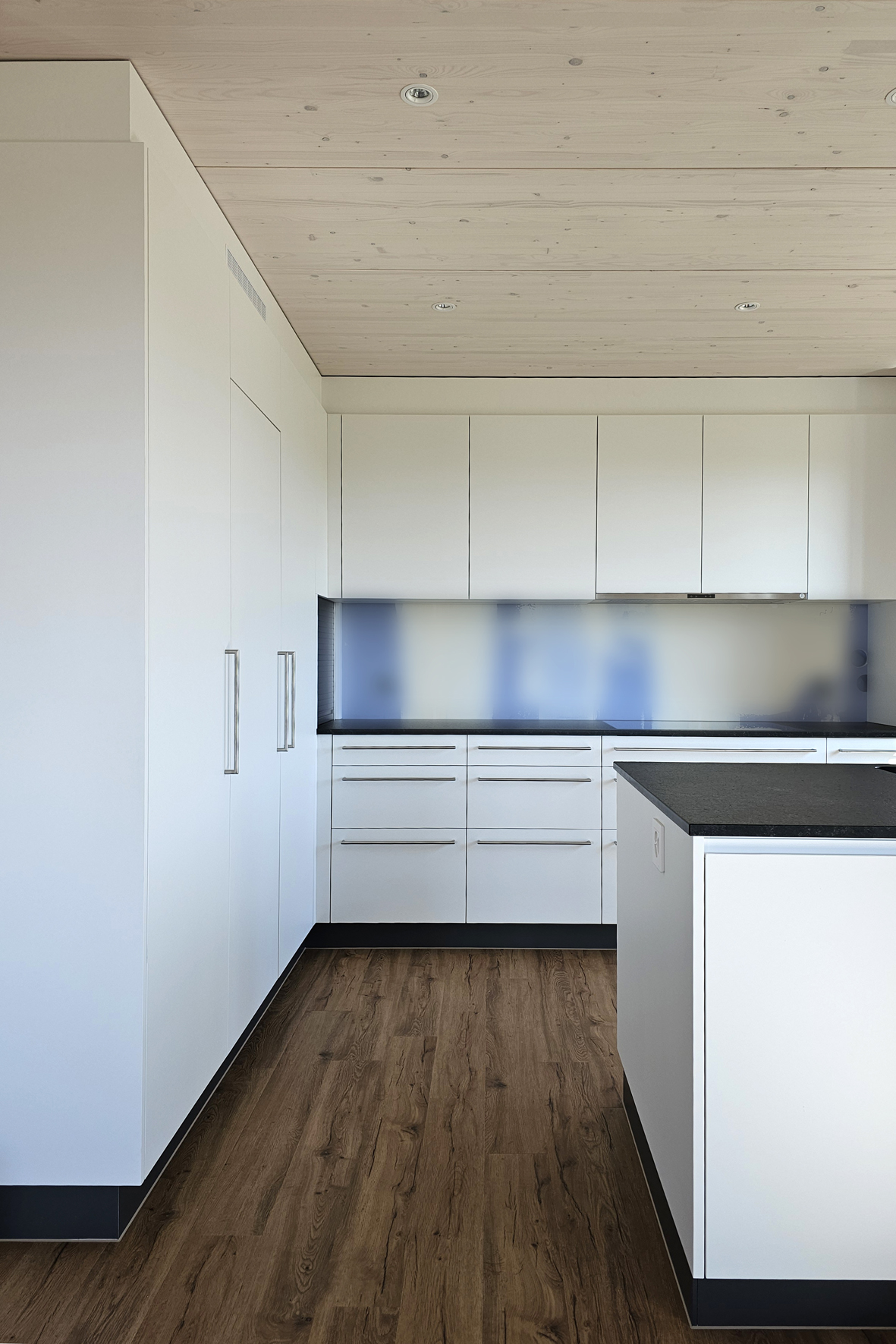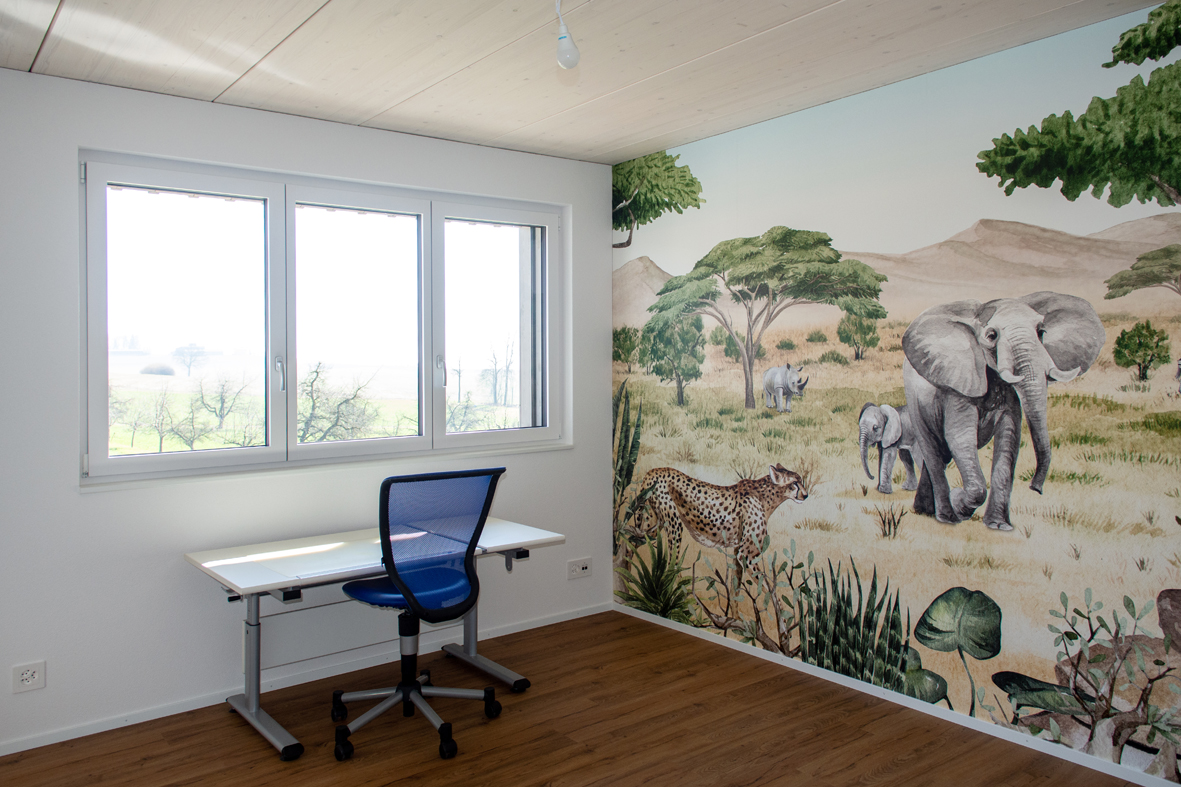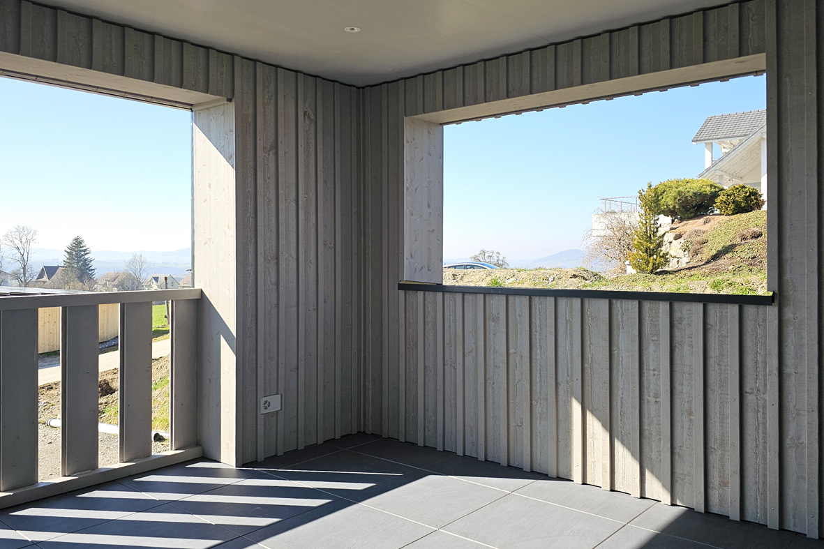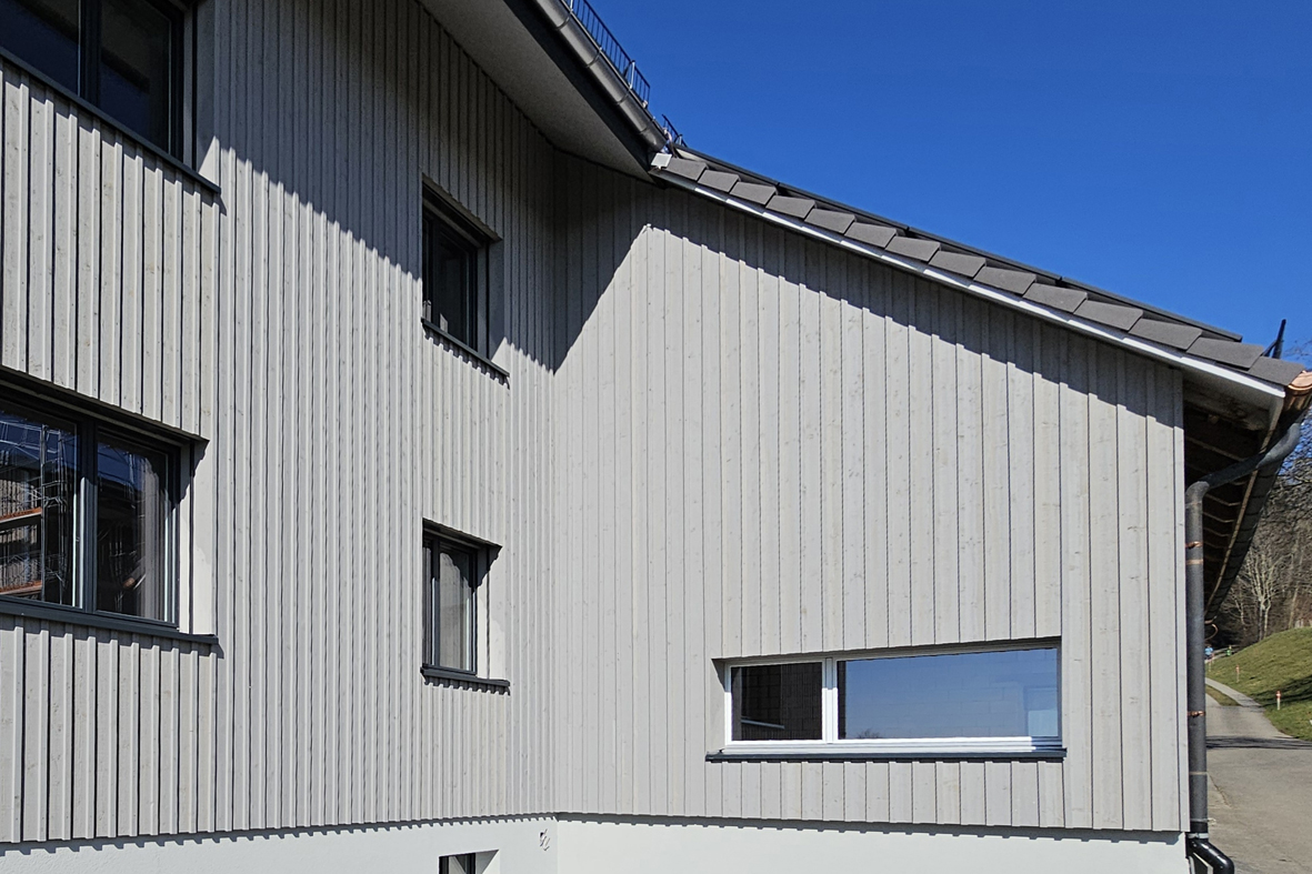 Das Kellergeschoss ist in Massivbauweise errichtet, die weiteren Stockwerke sind aus Holzelementen gefertigt, welche an die bestehende Scheune angepasst wurden. Die integrierte Loggia mit Blick über das ganze Seetal lädt im Erdgeschoss zum Verweilen ein. Die grosszügigen Zimmer in den oberen Geschossen sind sehr hell gestaltet und bieten ausreichend Platz, um sich zurückzuziehen. Ergänzt ist das ganze Gebäude mit einer grossen und leistungsfähigen PV-Anlage.