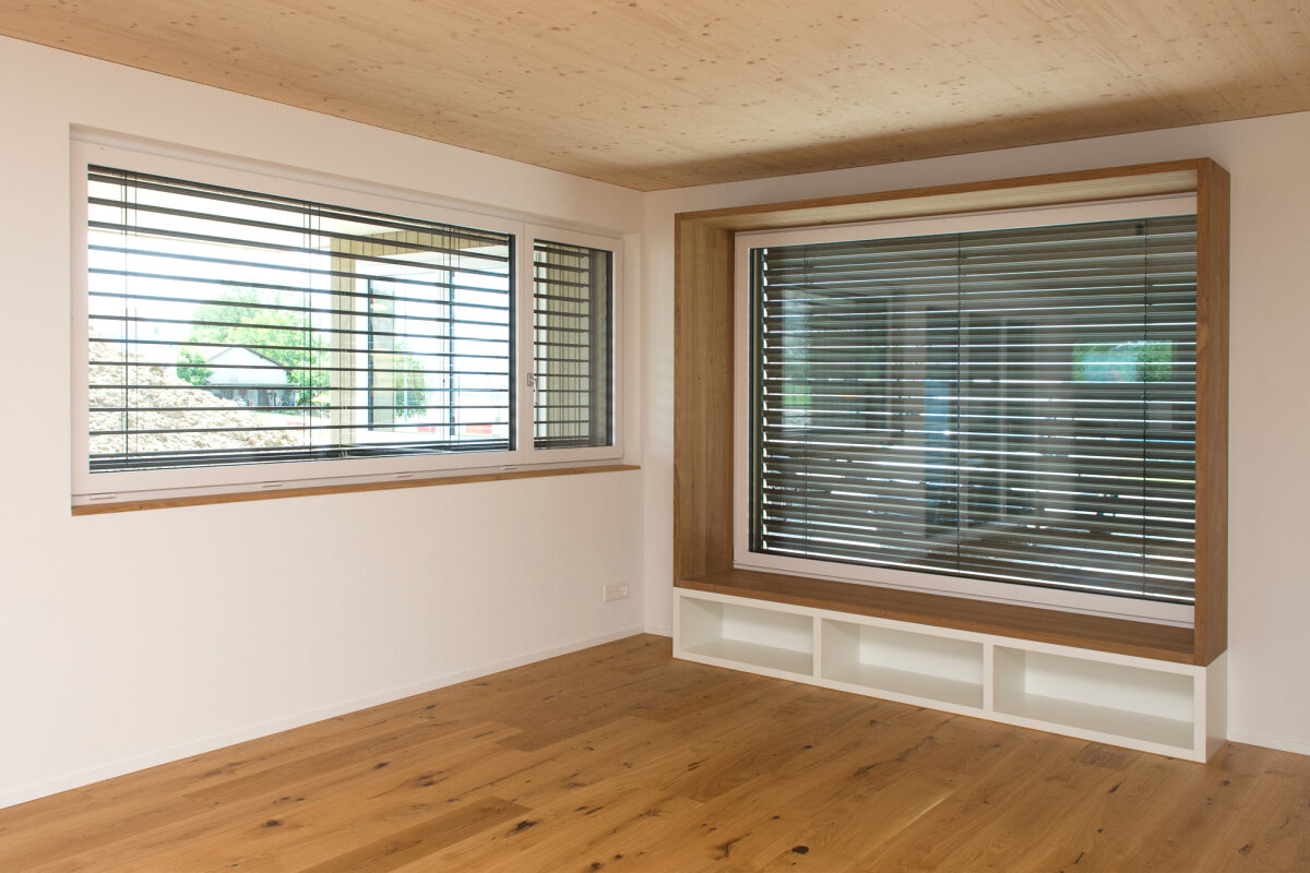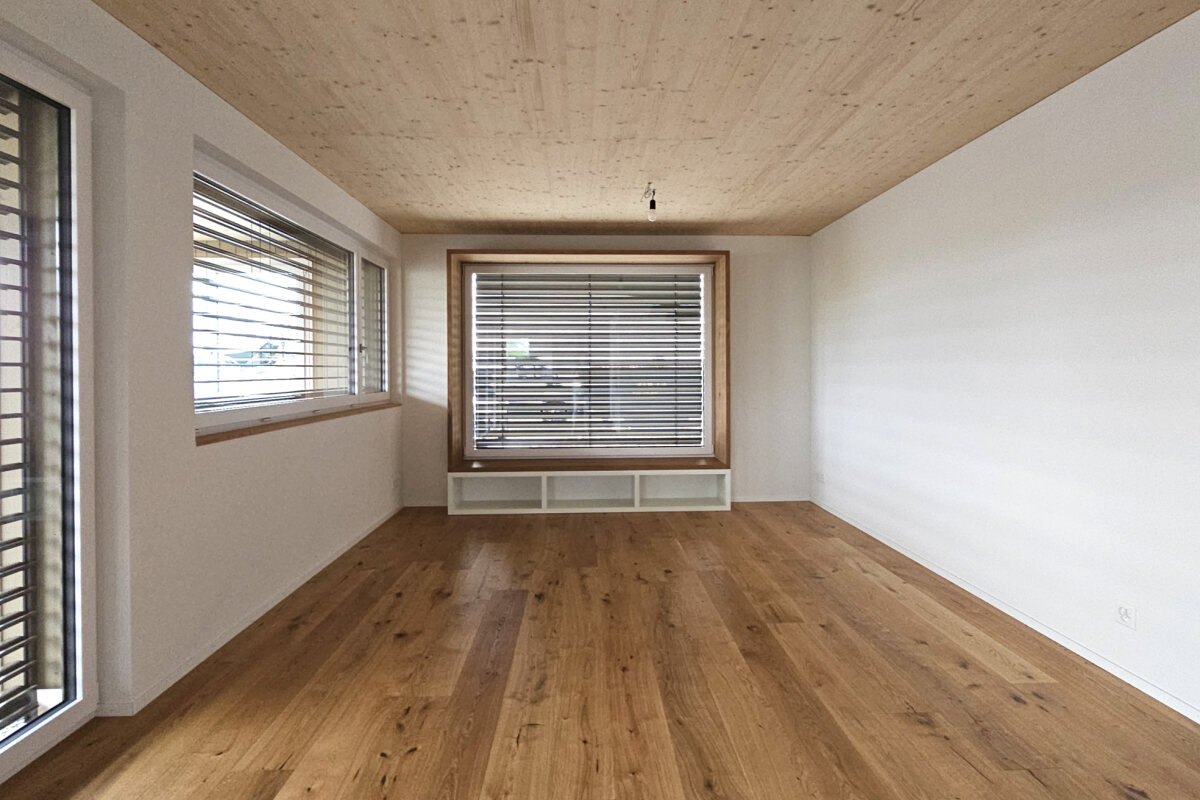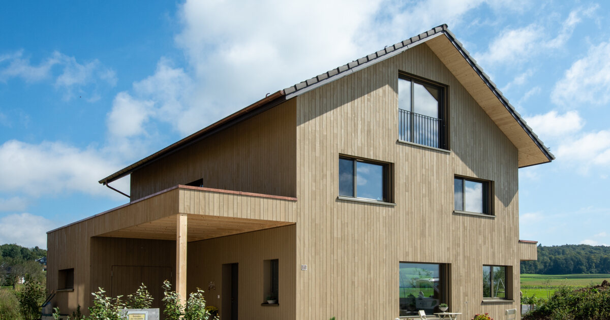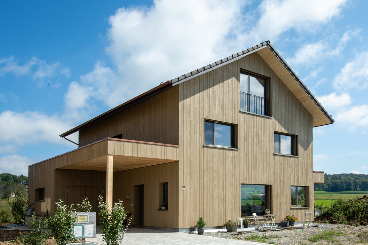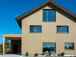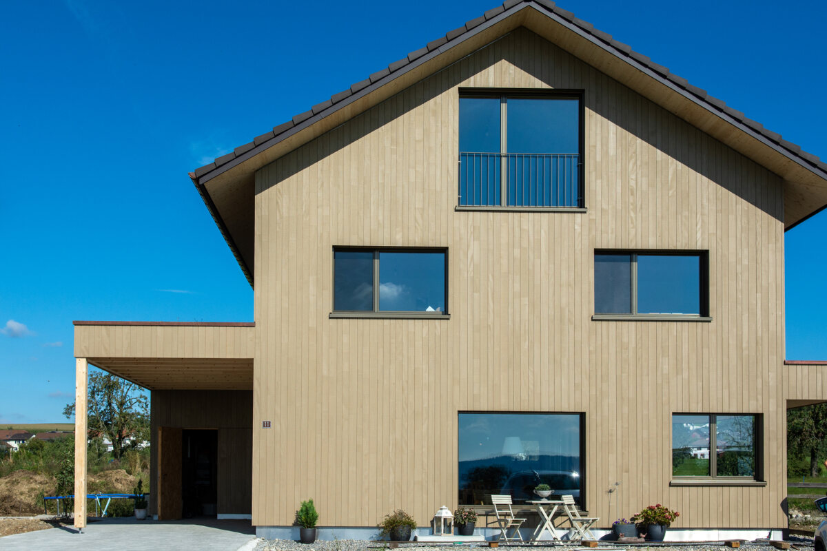 Am Übergang zwischen Siedlungsrand und Landwirtschaft steht dieses freistehende Einfamilienhaus in zeitgenössischer Holzbauweise. Die vertikale Holzschalung fügt sich harmonisch in die ländliche Umgebung ein. Das prominent gestaltete Sitzfenster im Erdgeschoss lenkt den Blick gezielt in die Weite und schafft einen charaktervollen Aufenthaltsort.