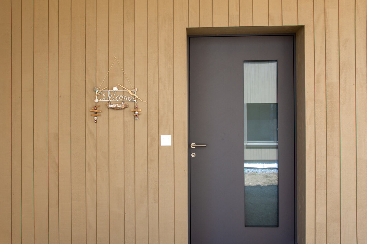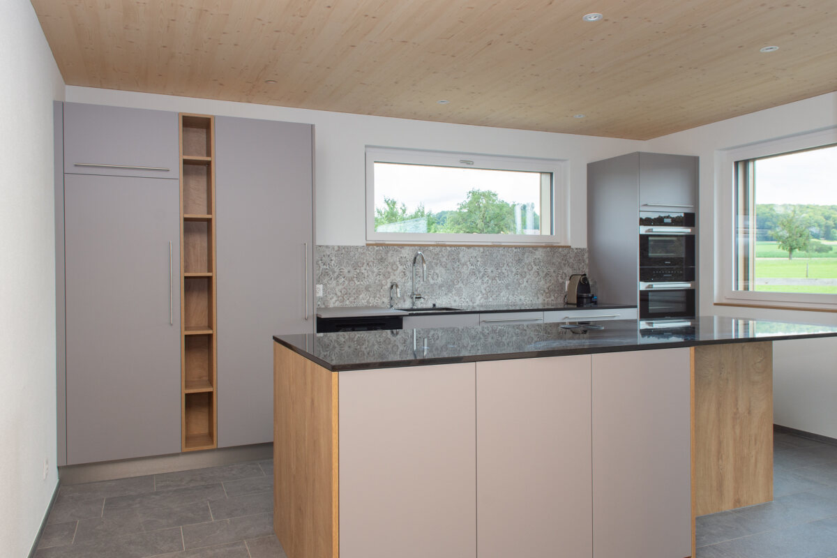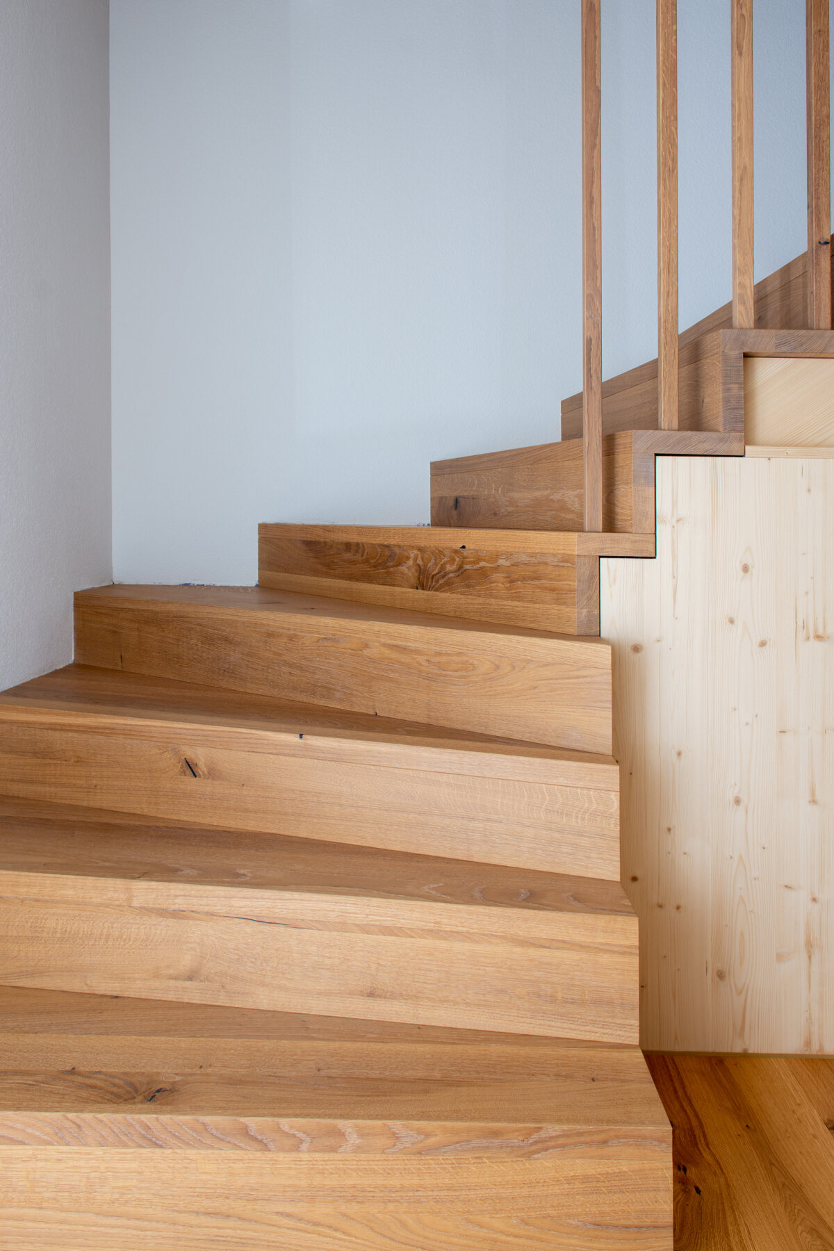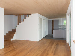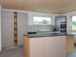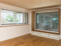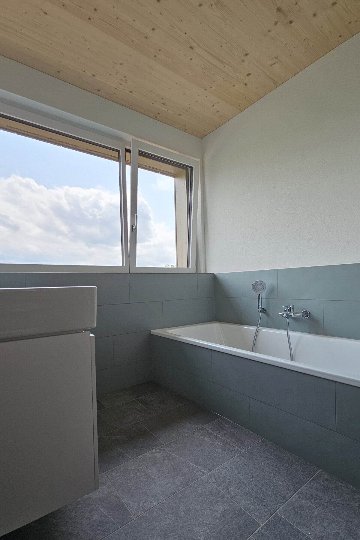 Am Übergang zwischen Siedlungsrand und Landwirtschaft steht dieses freistehende Einfamilienhaus in zeitgenössischer Holzbauweise. Die vertikale Holzschalung fügt sich harmonisch in die ländliche Umgebung ein. Das prominent gestaltete Sitzfenster im Erdgeschoss lenkt den Blick gezielt in die Weite und schafft einen charaktervollen Aufenthaltsort.