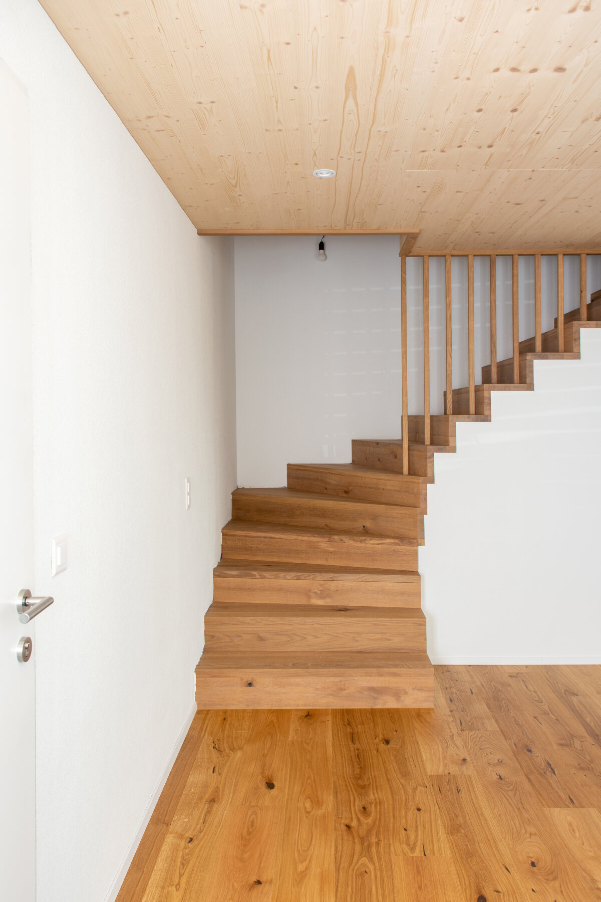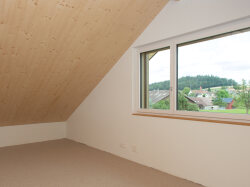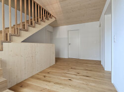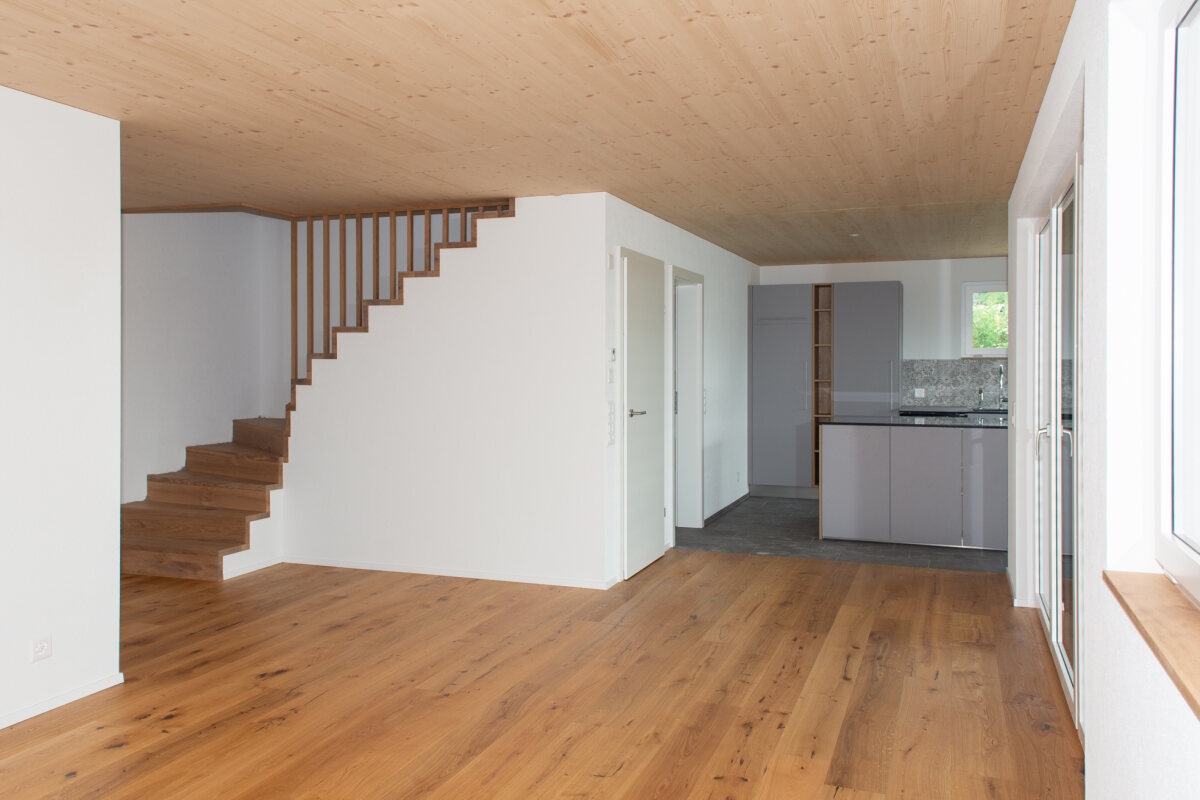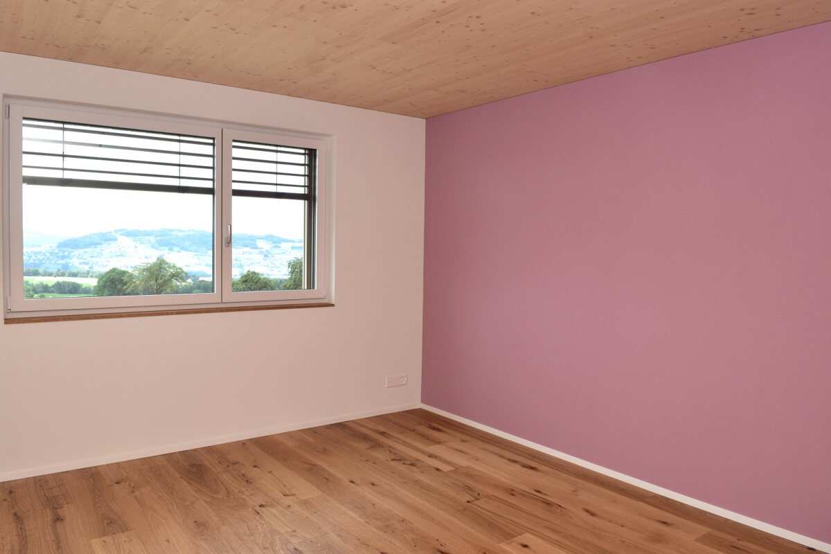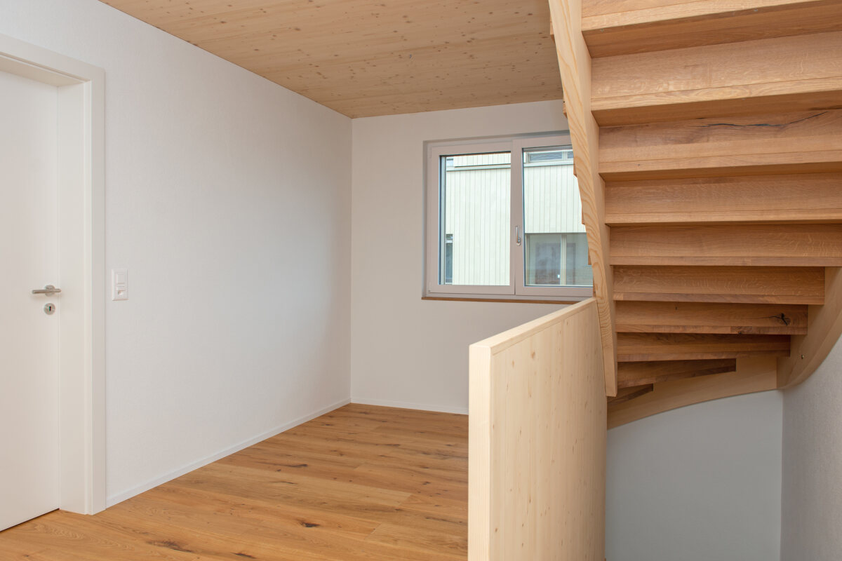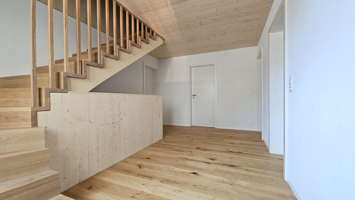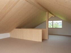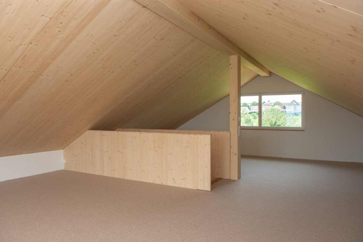 Eine angebaute Werkstatt ergänzt das Erdgeschoss funktional und bietet Platz für handwerkliche Tätigkeiten. In den oberen Geschossen befinden sich die privaten Rückzugsräume: Schlafräume im Obergeschoss sowie ein grosszügiger, offen nutzbarer Raum im Dachgeschoss, der vielfältige Nutzungsmöglichkeiten erlaubt.